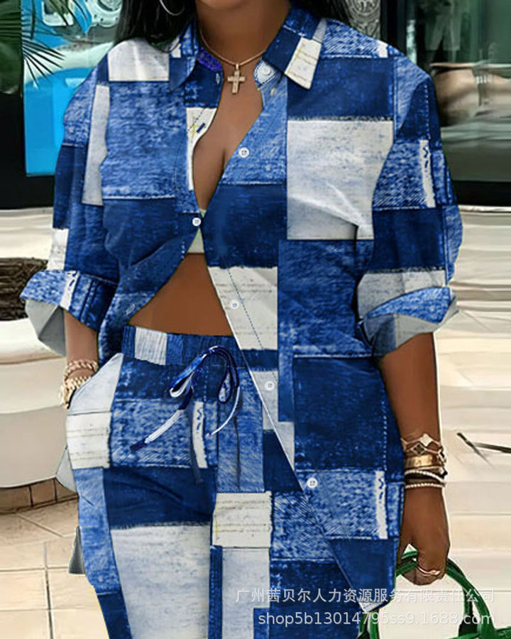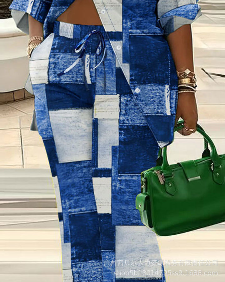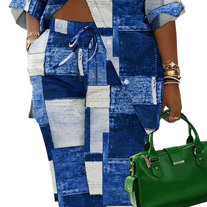 P1LPU3646C European and American large-size women's clothing imitation denim printing commuter leisure set (2-piece set)