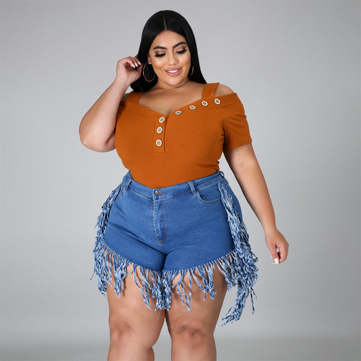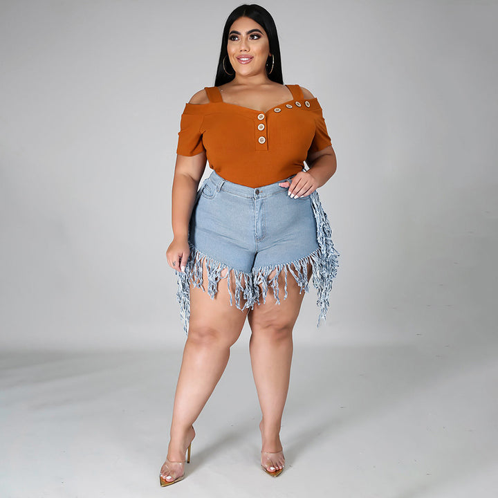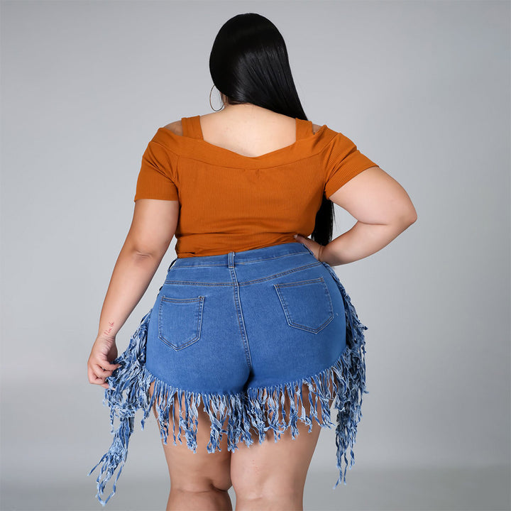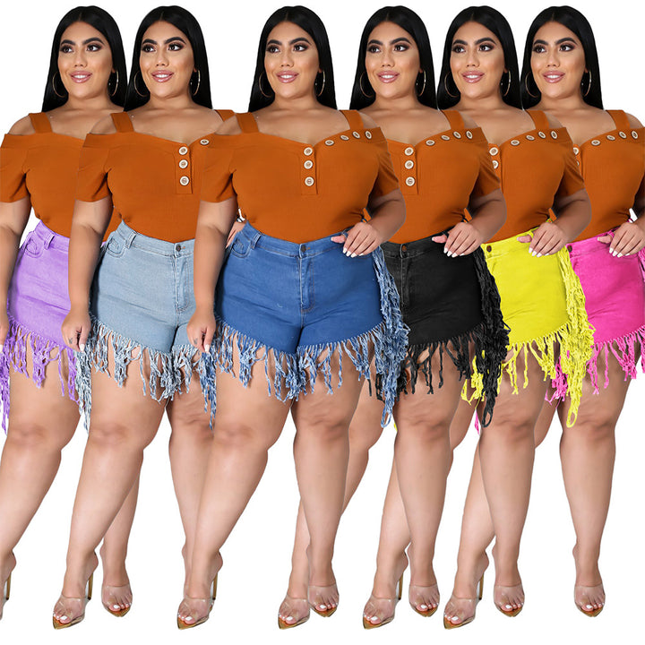 P3778 spot wholesale European and American broken fringed polished denim shorts large size w...