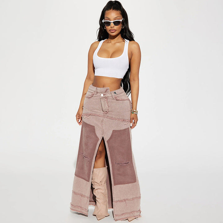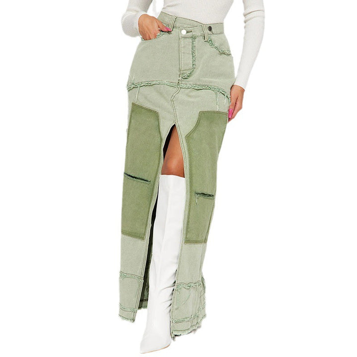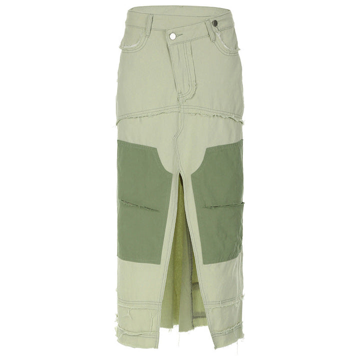 personalized street women's clothing washed contrasting colors irregular denim skirt raw edge pocket split long skirt autumn