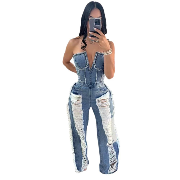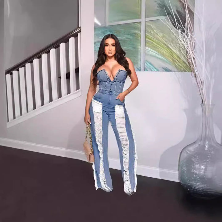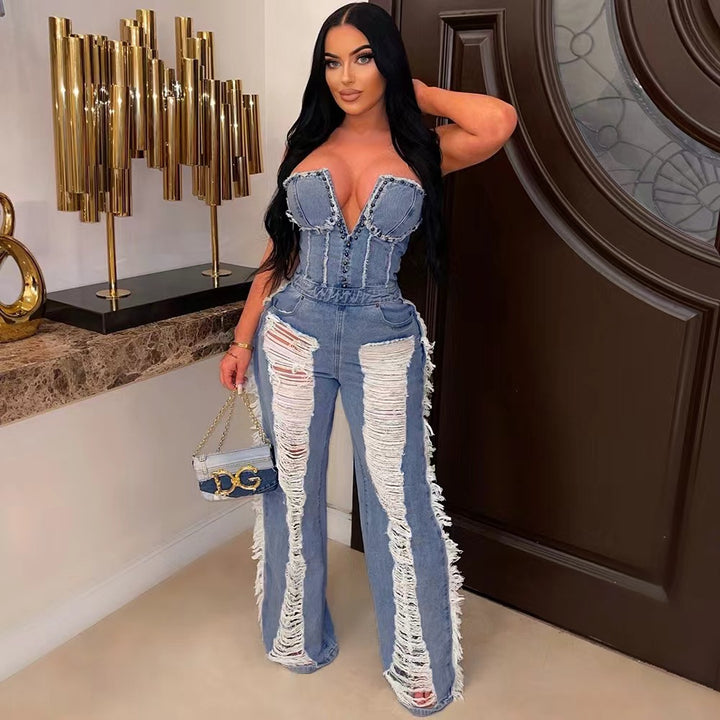 popular new fashion trend personalized tassel ripped nail drill washed denim jumpsuit trousers
