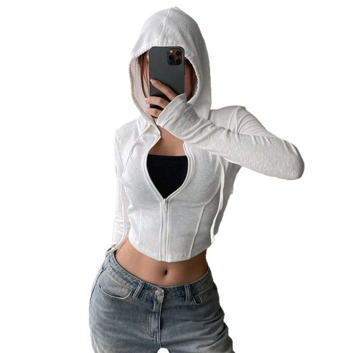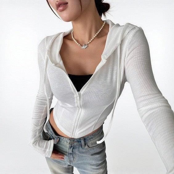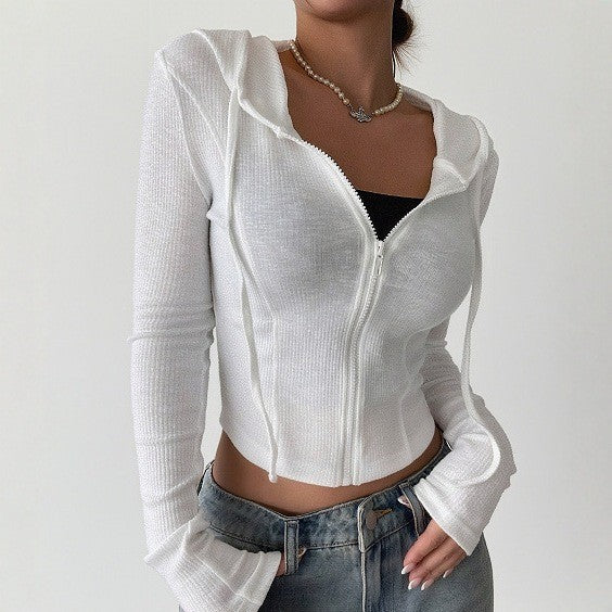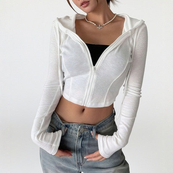 Pre-sale Cross-border European and American Spice Girls Hooded Short Women's Slim Long Sleeve Cardigan Navel Zipper Women's Comfortable Sports Top