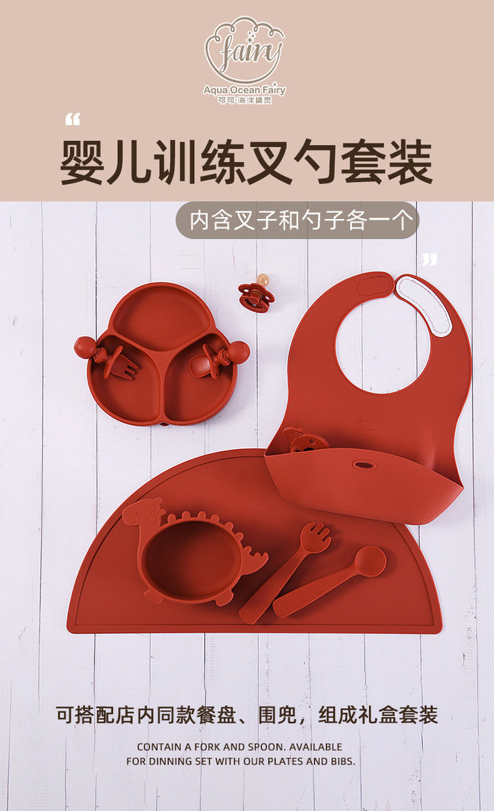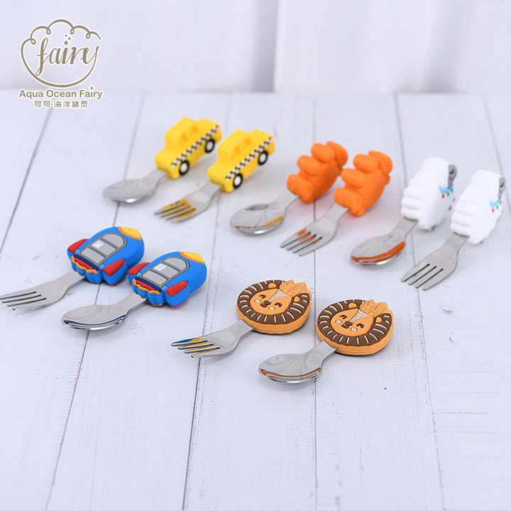 Silicone training fork and spoon, Square handle training fork and spoon, Round handle training fork and spoon, Animal head metal fork and spoon, Bamboo and wood fork and spoon, Dinosaur fork and spoon, Monochrome animal metal fork and spoon, monochrome integrated fork and spoon |