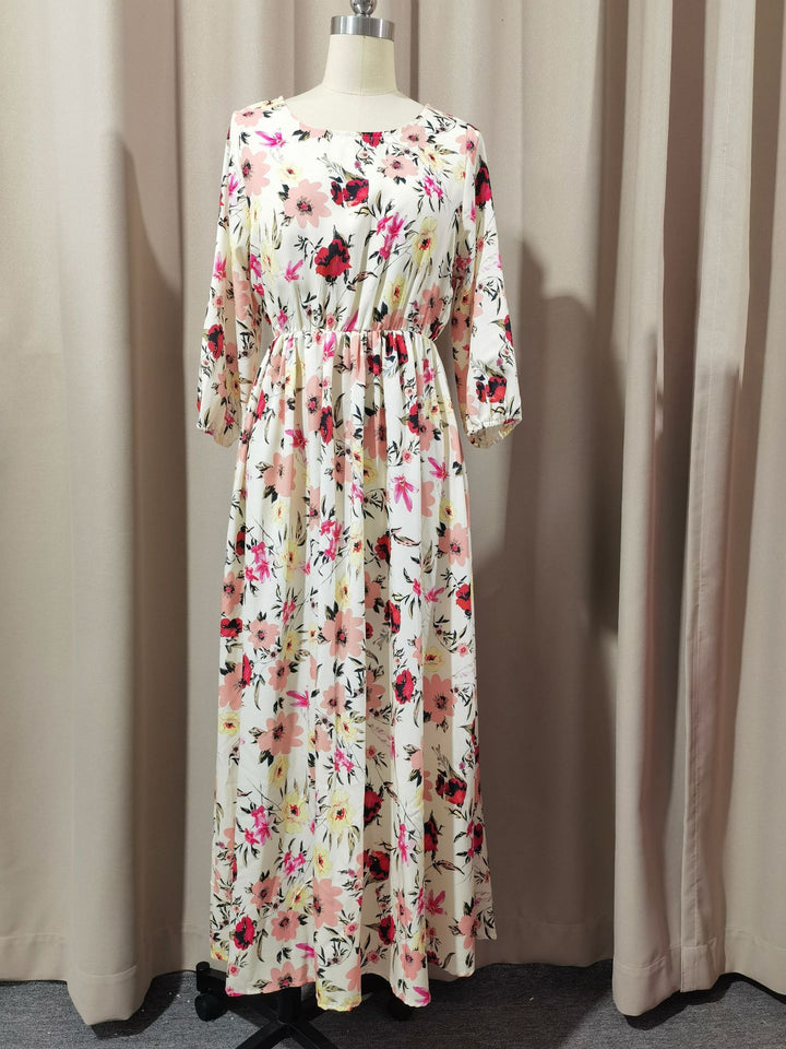 Printed long dress 2024 Europe, America, French commuter style retro pendulum round neck floral dress