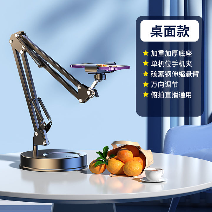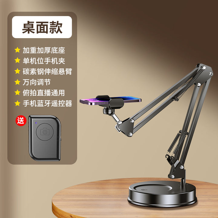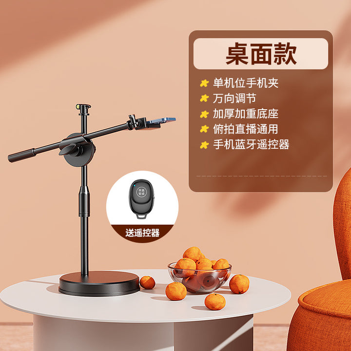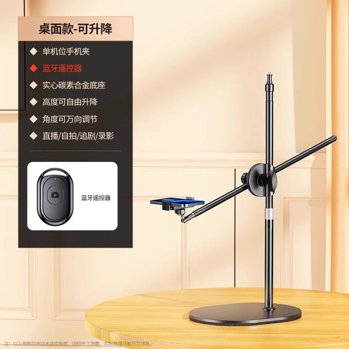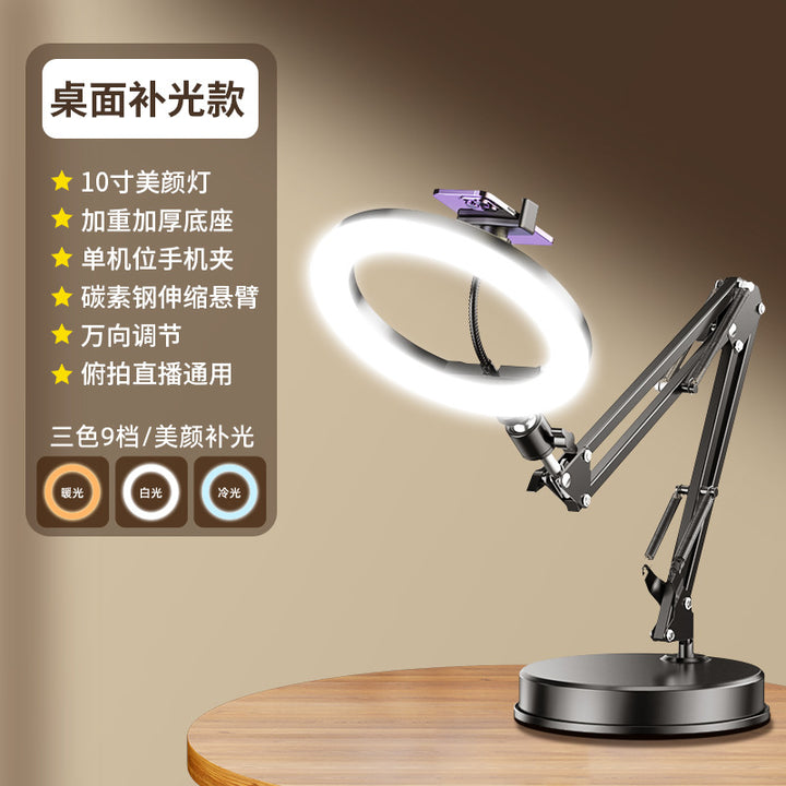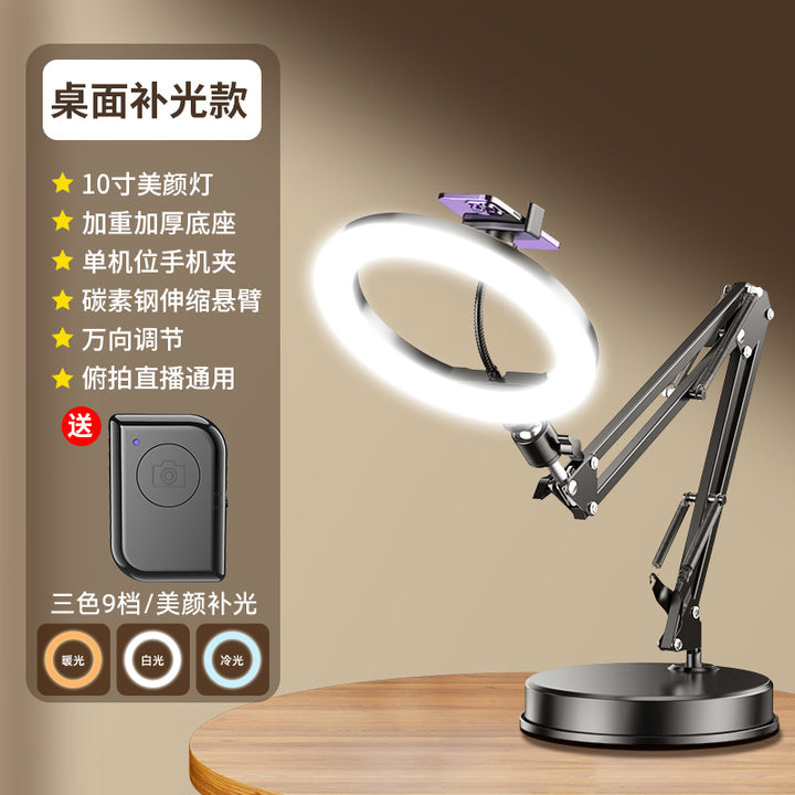 基础桌面款【白色】自由升降角度随意调节., ↓↓以下为【旗舰升级悬臂俯拍款】灵活秒调节þ加宽加厚底座, 底座加重【碳素钢悬臂】桌面俯拍直播支架, 加宽加厚【碳素钢悬臂】俯拍直播支架+蓝牙录拍器.., 加宽加厚【碳素钢悬臂】桌面俯拍支架+26cm三色美颜灯.., 加宽加厚【碳素钢悬臂】桌面俯拍支架+26cm三色美颜灯+蓝牙录拍器., 加重【桌面伸缩加长款】-, 加重【桌面伸缩加长】补光款+16cm美颜灯.., 加重【桌面伸缩加长款】送蓝牙遥控器, 加重【桌面伸缩加长】补光款+16cm美颜灯+蓝牙遥控器., 加重【桌面伸缩加长】补光款+26cm美颜灯.., Emphasis [Desktop telescopic and lengthening] fill light model + 26cm beauty light + Bluetooth remote control., Widened and thickened [Carbon Steel Cantilever] desktop overhead shooting live stream bracket.., Basic desktop model [black] Free lifting angle can be adjusted at will., The following is [Top with professional details overhead shooting bracket metal solid base], The angle and height of the top version [metal solid base] can be adjusted.., Top version [metal solid base] Angle and height adjustable + Bluetooth remote control., The top version [metal solid base] has an adjustable angle and height + 26cm beauty lamp., 顶配版【金属实心底座】角度高度可调节+26cm美颜灯+遥控器., 底座加重【碳素钢悬臂】桌面俯拍直播支架- |