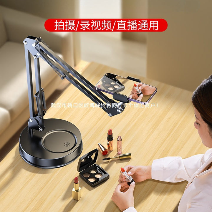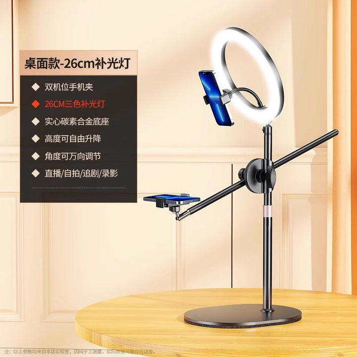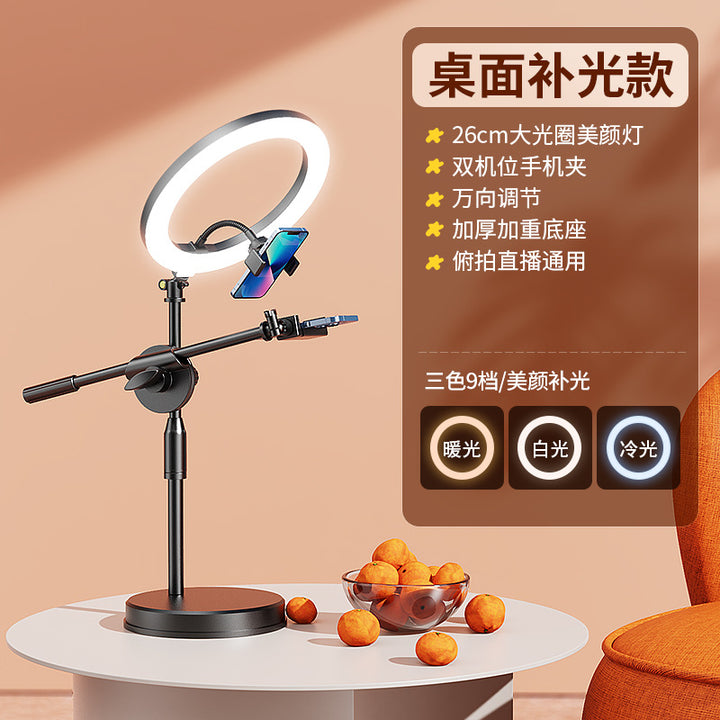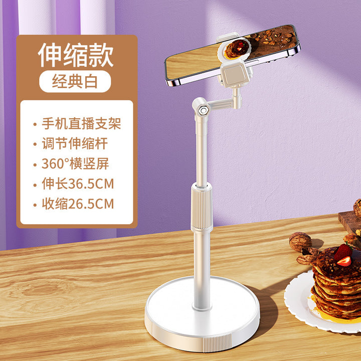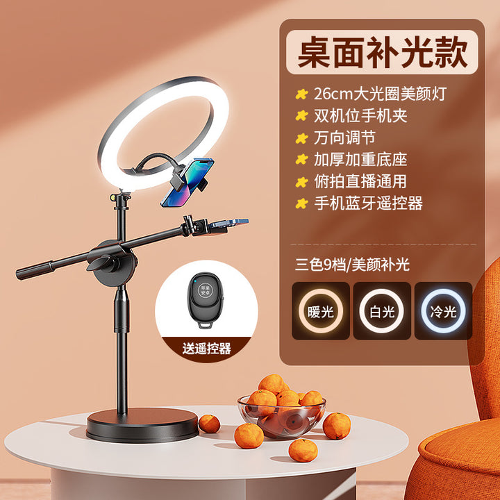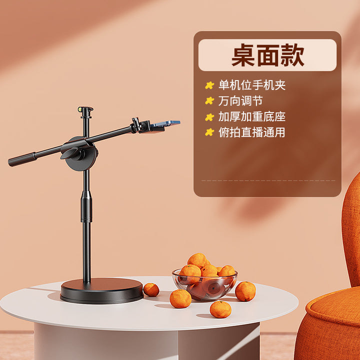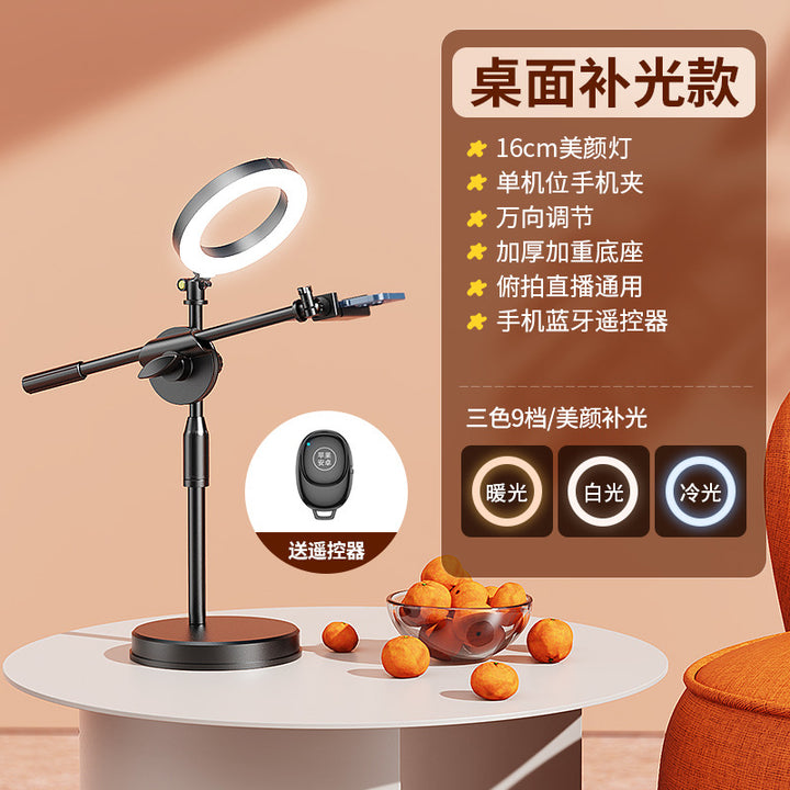 基础桌面款【白色】自由升降角度随意调节., ↓↓以下为【旗舰升级悬臂俯拍款】灵活秒调节þ加宽加厚底座, 底座加重【碳素钢悬臂】桌面俯拍直播支架, 加宽加厚【碳素钢悬臂】俯拍直播支架+蓝牙录拍器.., 加宽加厚【碳素钢悬臂】桌面俯拍支架+26cm三色美颜灯.., 加宽加厚【碳素钢悬臂】桌面俯拍支架+26cm三色美颜灯+蓝牙录拍器., 加重【桌面伸缩加长款】-, 加重【桌面伸缩加长】补光款+16cm美颜灯.., 加重【桌面伸缩加长款】送蓝牙遥控器, 加重【桌面伸缩加长】补光款+16cm美颜灯+蓝牙遥控器., 加重【桌面伸缩加长】补光款+26cm美颜灯.., Emphasis [Desktop telescopic and lengthening] fill light model + 26cm beauty light + Bluetooth remote control., Widened and thickened [Carbon Steel Cantilever] desktop overhead shooting live stream bracket.., Basic desktop model [black] Free lifting angle can be adjusted at will., The following is [Top with professional details overhead shooting bracket metal solid base], The angle and height of the top version [metal solid base] can be adjusted.., Top version [metal solid base] Angle and height adjustable + Bluetooth remote control., The top version [metal solid base] has an adjustable angle and height + 26cm beauty lamp., 顶配版【金属实心底座】角度高度可调节+26cm美颜灯+遥控器., 底座加重【碳素钢悬臂】桌面俯拍直播支架- |