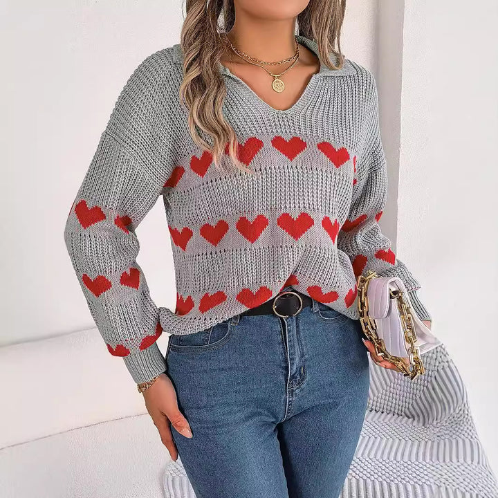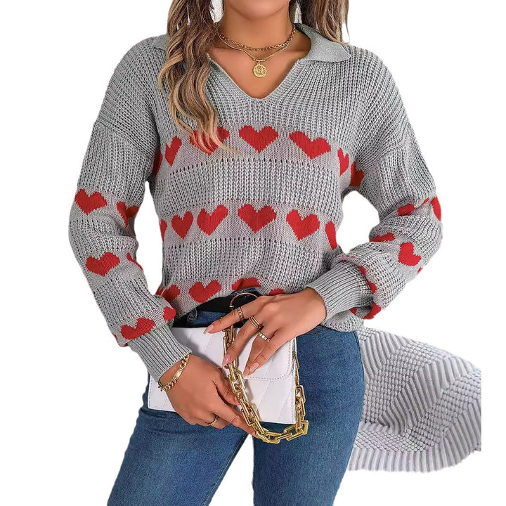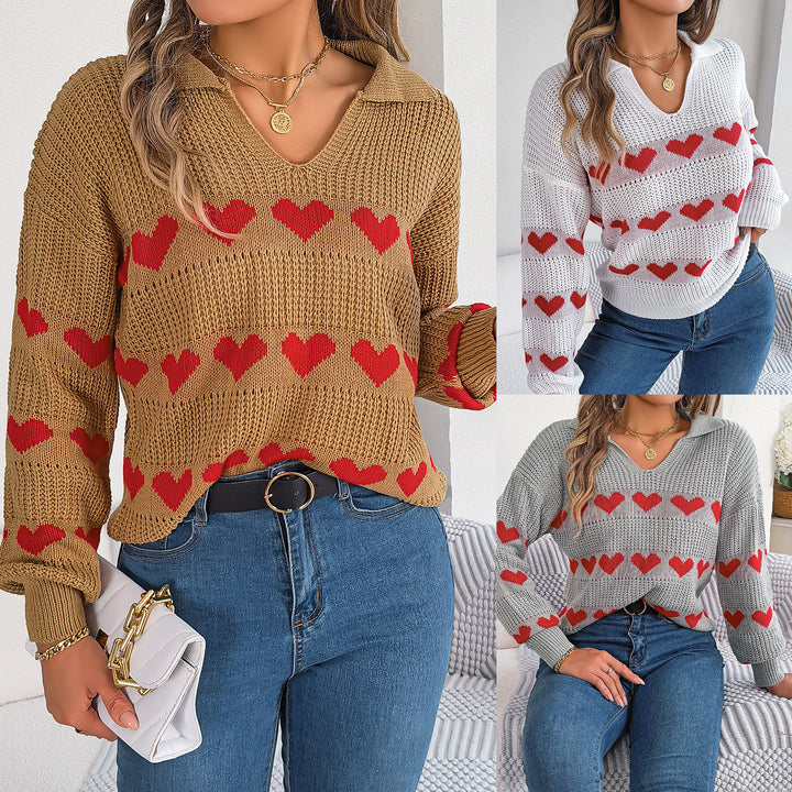 Real shot 2025 autumn and winter casual chicken heart neck lantern sleeve contrasting color love pullover sweater, independent station women's clo...