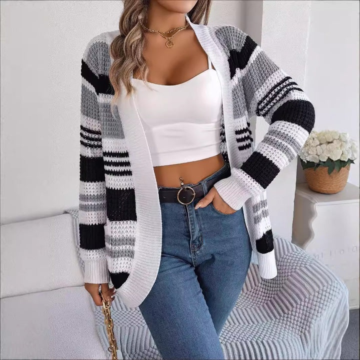Real shot 2025 autumn and winter casual contrasting colors striped pockets long-sleeved sweater cardigan jacket, independent station women's clothing
