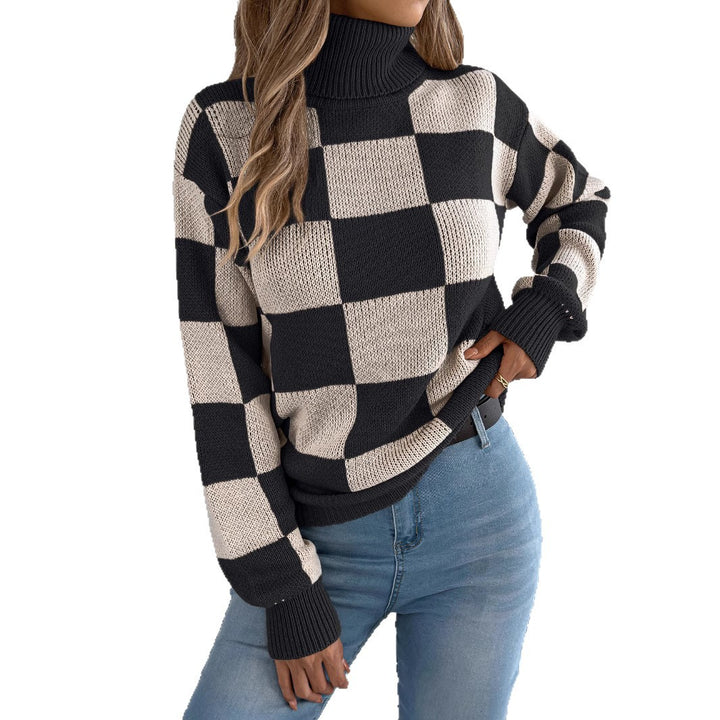 Real shot 2025 autumn and winter European and American casual turtleneck contrasting color plaid lantern long-sleeved sweater, women's clothing