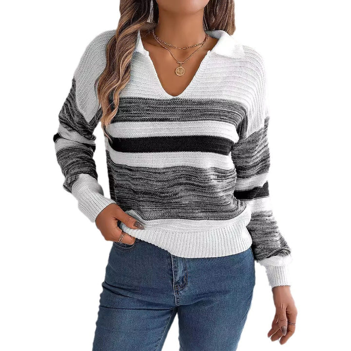 Real shot, European, American autumn and winter casual lapel contrasting striped long-sleeved knitted pullover sweater, independent station women'...