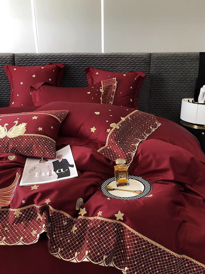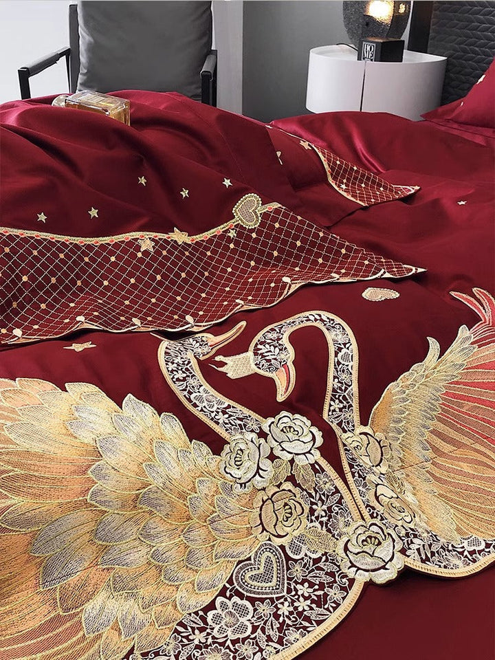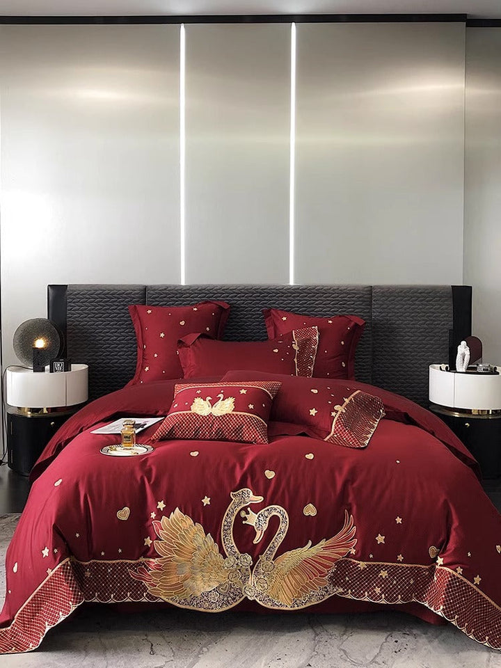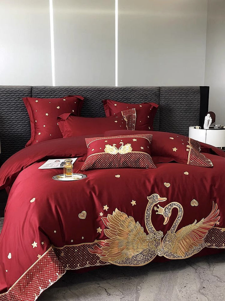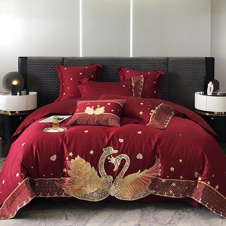 Red festive swan embroidery 100 long-staple cotton four-piece set pure cotton satin bed sheet quilt cover cotton wedding 1.8