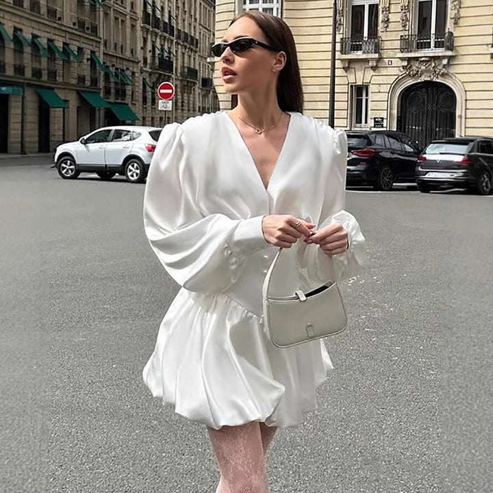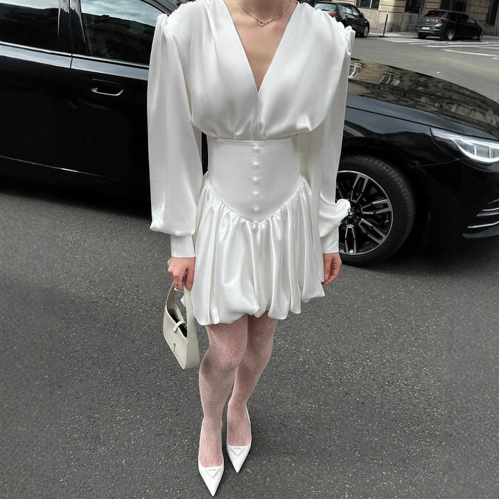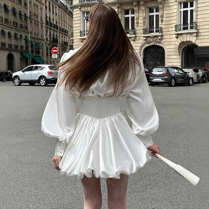 Retro elegant autumn white sexy V-neck lantern sleeve fashion tutu dress design sense satin casual dress