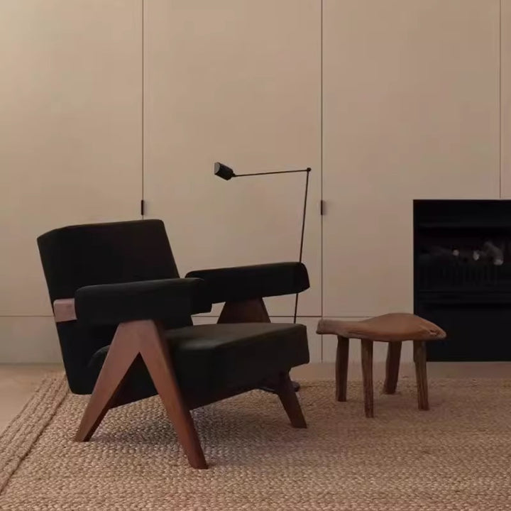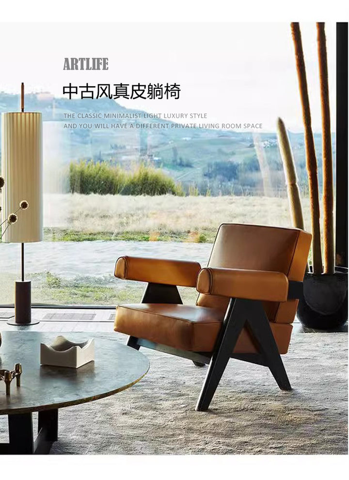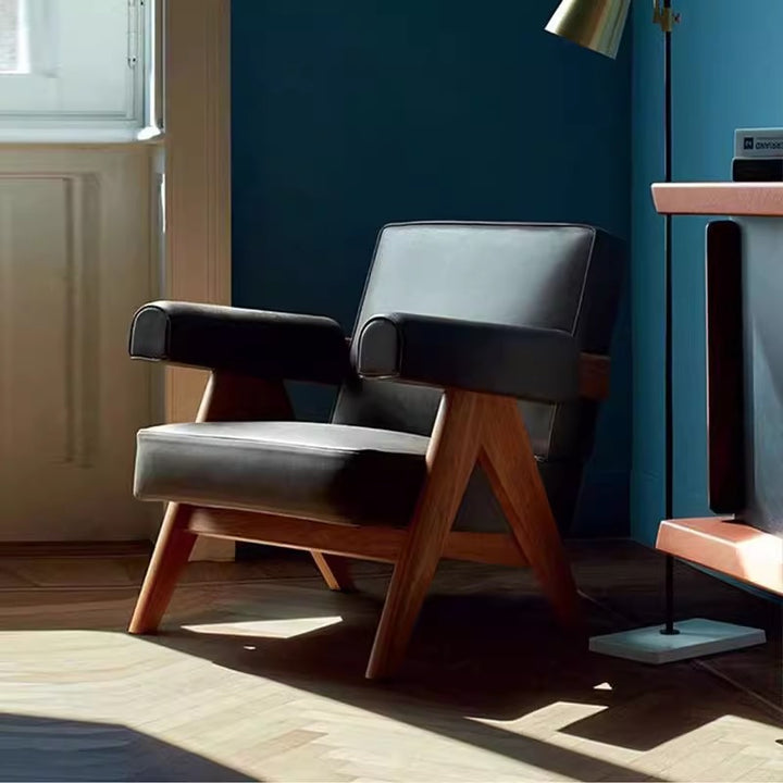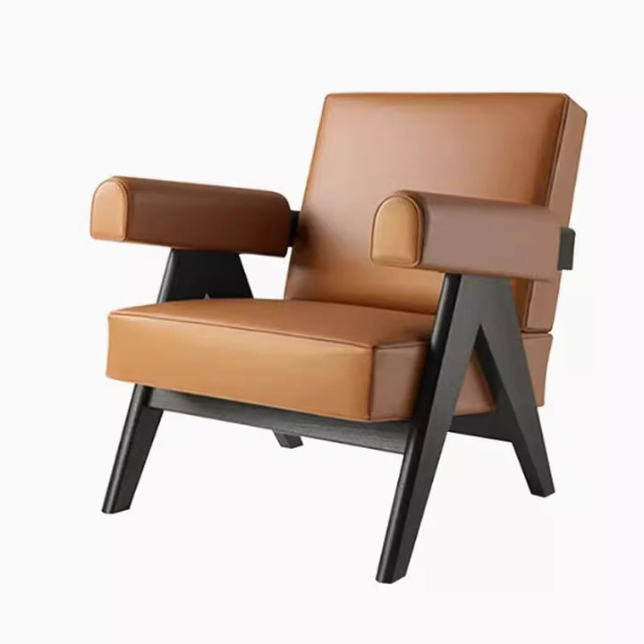 Retro Solid Wood Single Sofa Chair Wabi Wind Furniture Casual Double Leather Art Fabric Armrest Sofa