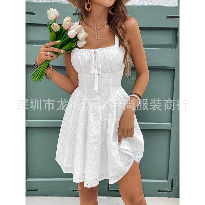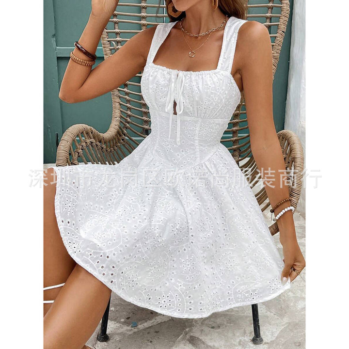 's new summer embroidery, white pleated suspender vest, short bubble skirt, elegant party dress