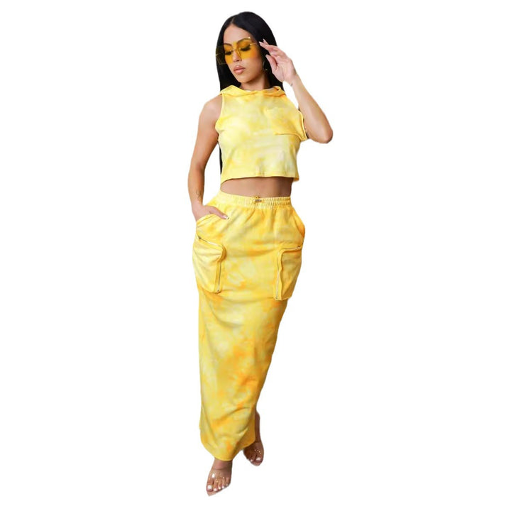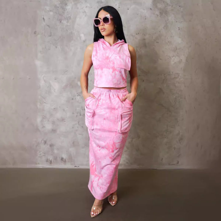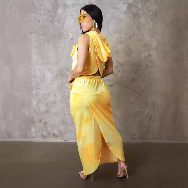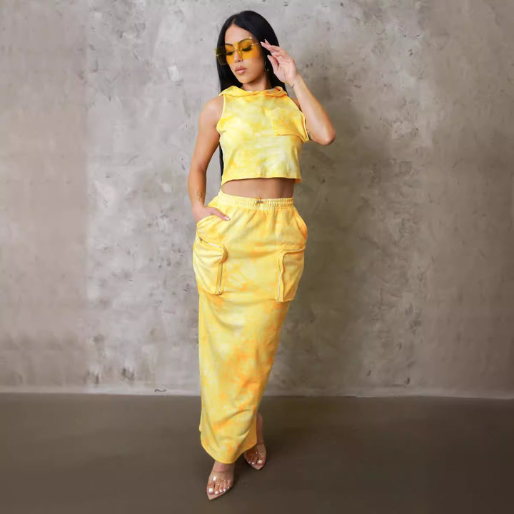 S10766 European, American, sexy, loose print hooded tooling pocket sleeveless vest split skirt set