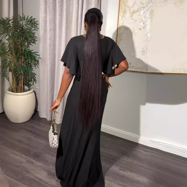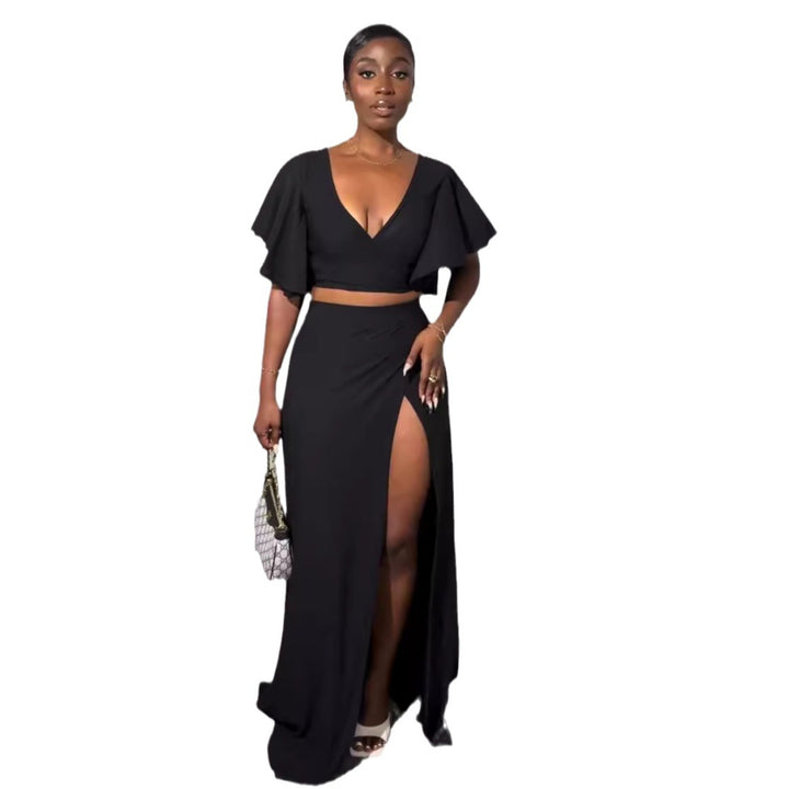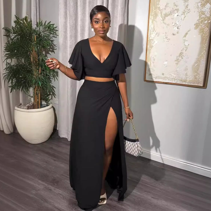 S10776 European and American sexy solid color flying sleeve lace V-neck split strap skirt set
