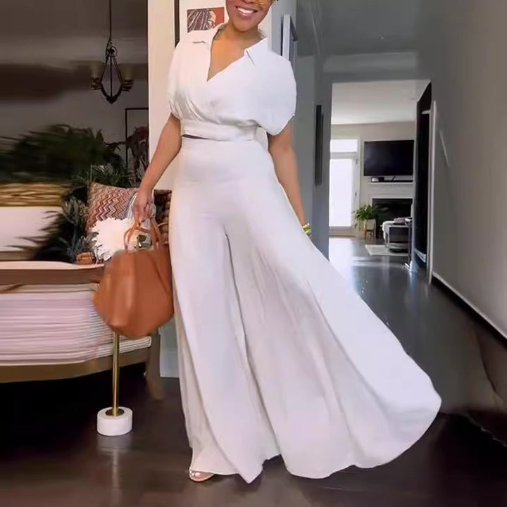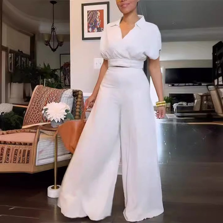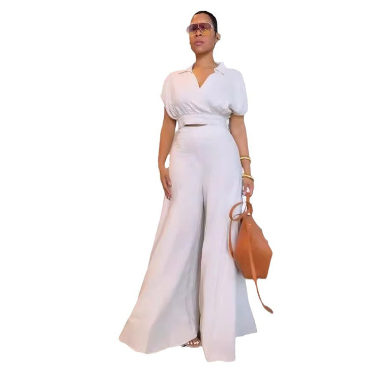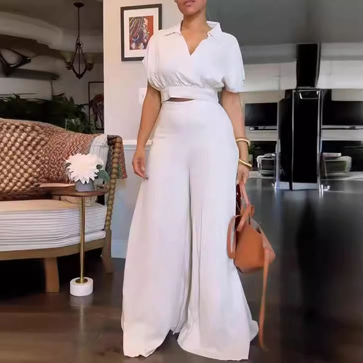 S10780 European and American solid color waist loose flared pants set two-piece set