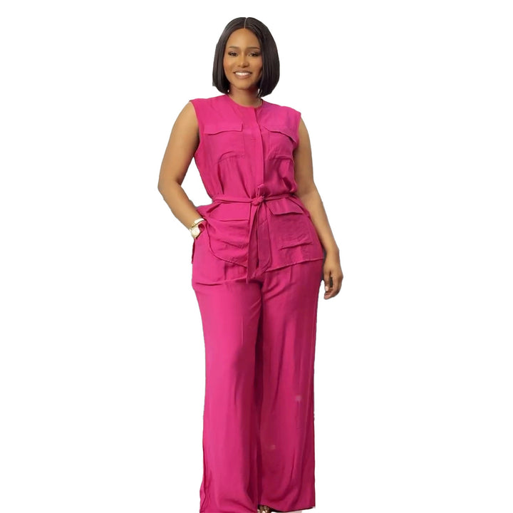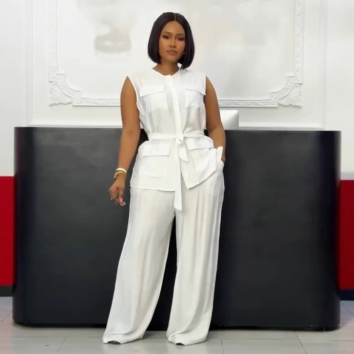 S11095 Commuter Casual Crew Neck Strap Sleeveless Cardigan Vest Wide Leg Pants Two-piece Set