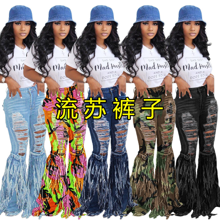 S3840 Cross-border wholesale European and American fringed polished denim shorts women's jeans casual flared pants
