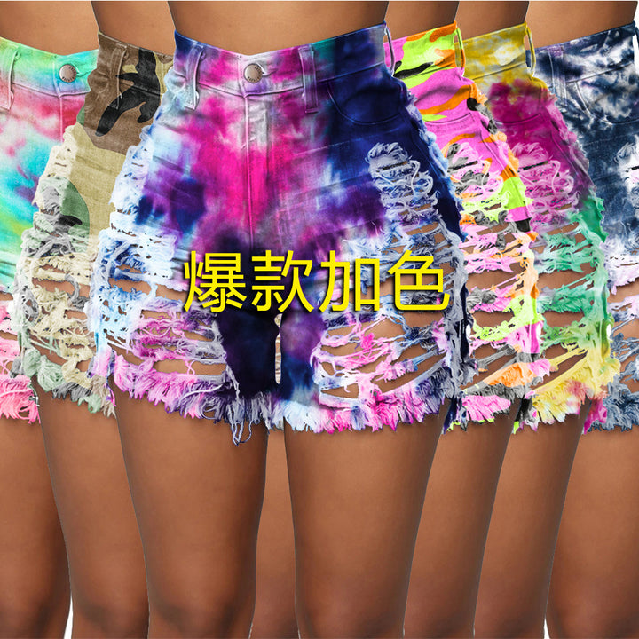 S3846 Cross-border wholesale European and American ripped sexy cut hollow button tie-dye printed denim shorts
