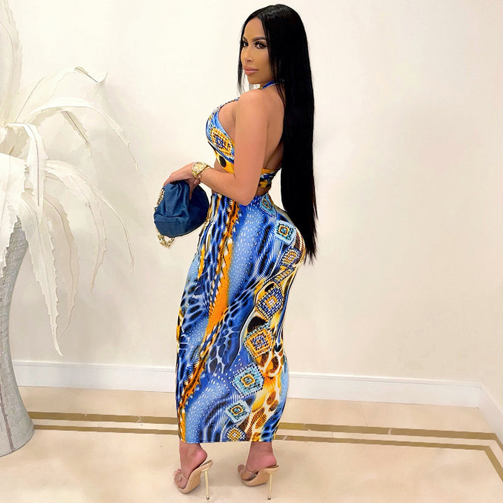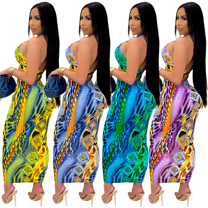 S390152 European and American women's clothing summer hollow neck tube top printed mesh strap sexy skirt set nightclub