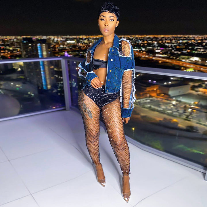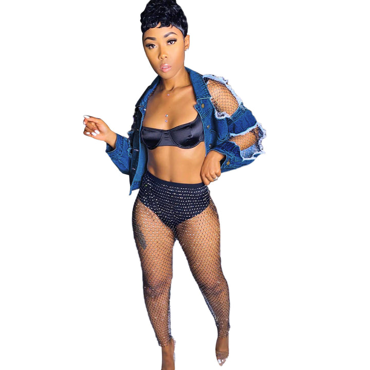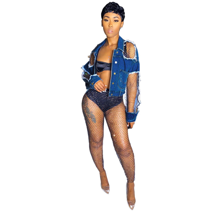 S390180 Cross-border denim jacket women's clothing, solid color ripped shoulder short denim jacket European and American
