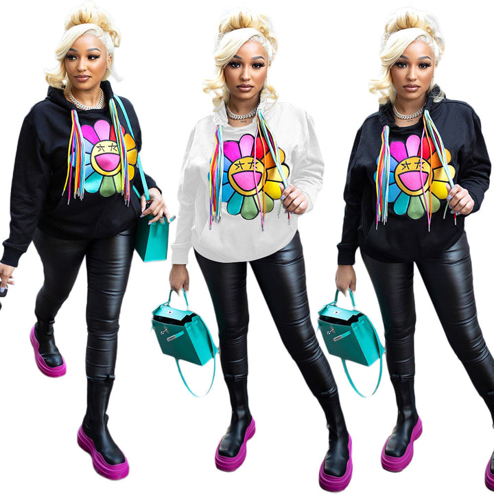 S390422 Cross-border Spring and Autumn Printed Top Women's Color Drawstring Hooded Pocket Long Sleeve Pullover Loose Sweater