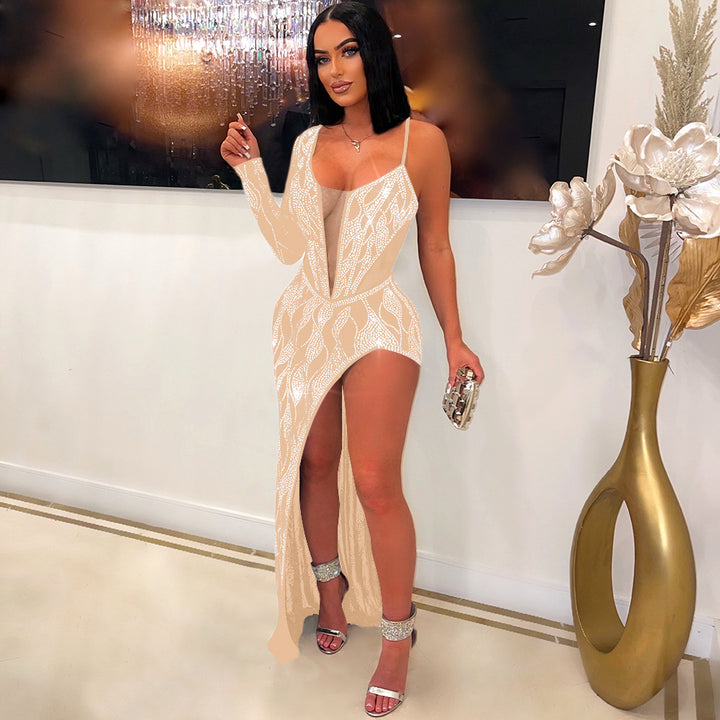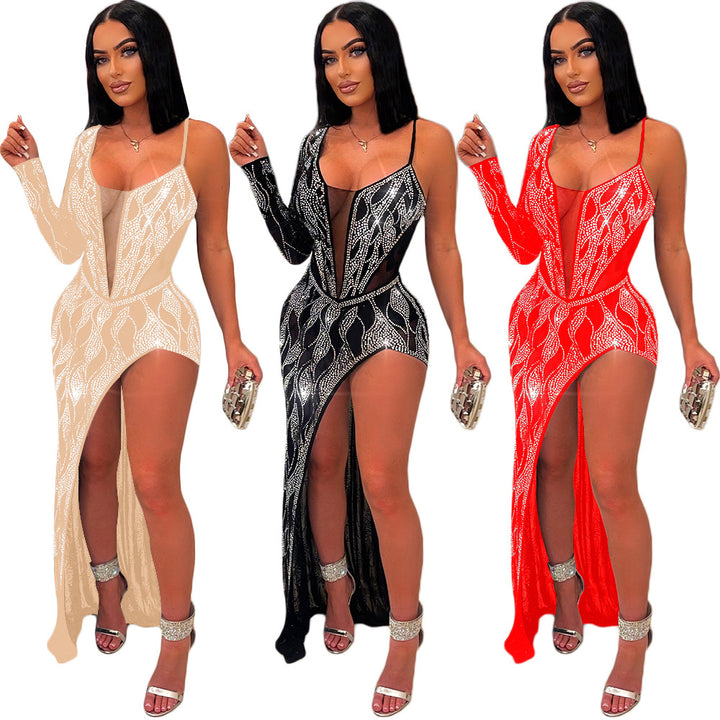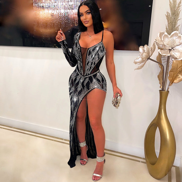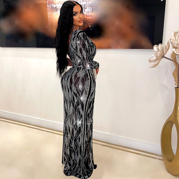 S390434 Cross-border eBay Women's Sexy Perspective Hot Diamond Long Sleeve Dress Women's Nightclub Evening Dress