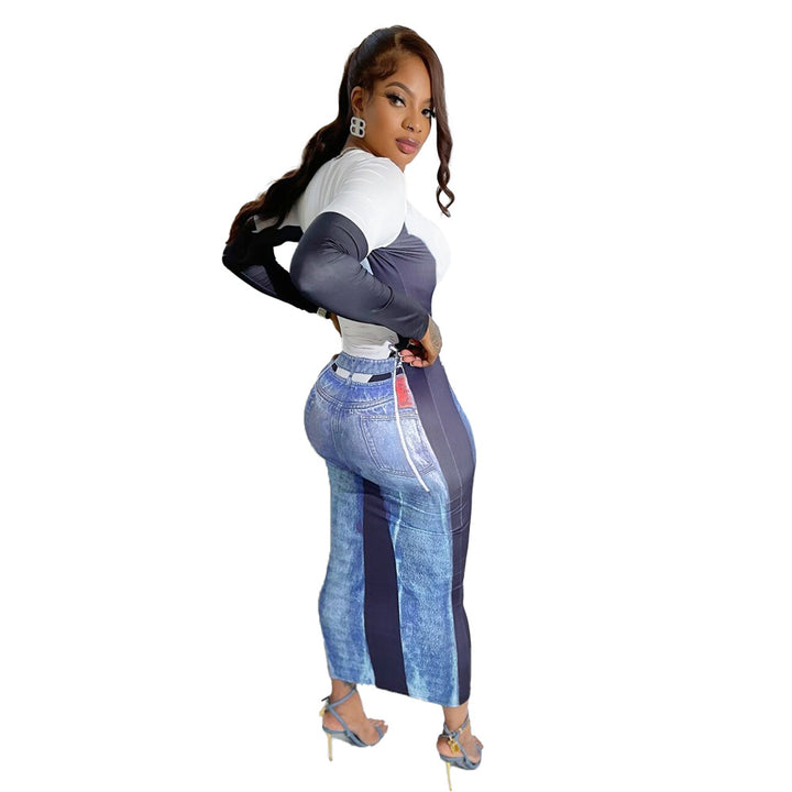 S390839 2023 Autumn New Fashion 3D Denim Printing Crew Neck Pullover Long Sleeve Slim and Skinny Dress