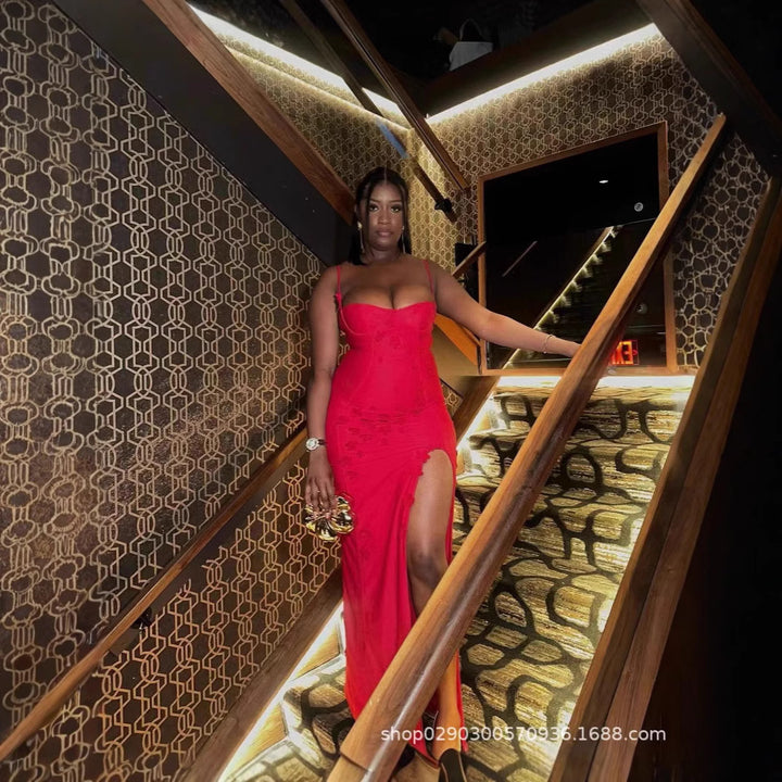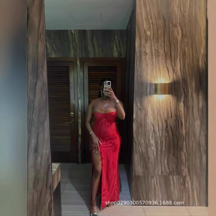 SDM112 autumn and winter European and American new suspender three-dimensional flower slit long dress party dress wholesale Dress
