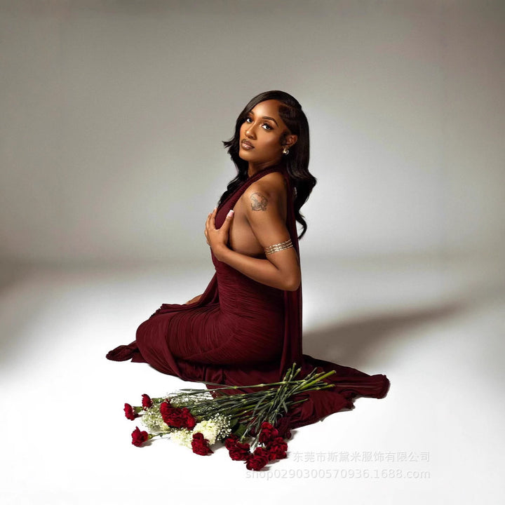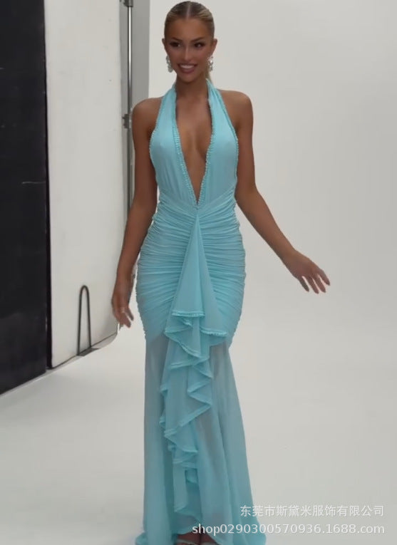 SDM163 temperament burgundy lace trailing straight neck deep V sexy dress vacation evening dress dress