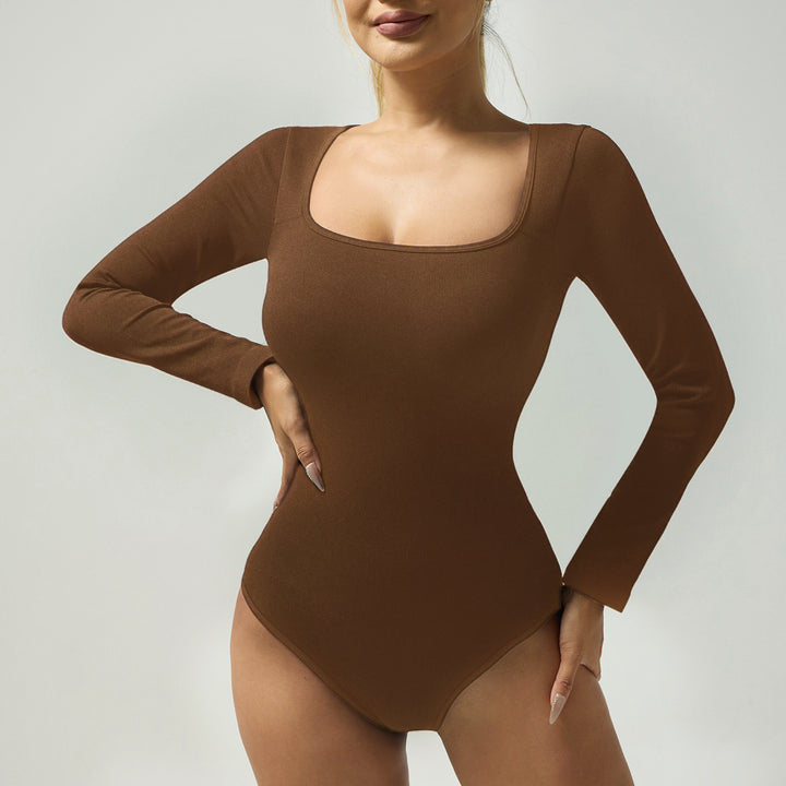 Seamless European and American thread long-sleeved square neck yoga onesie women's fashion casual women's fitness sports yoga clothes
