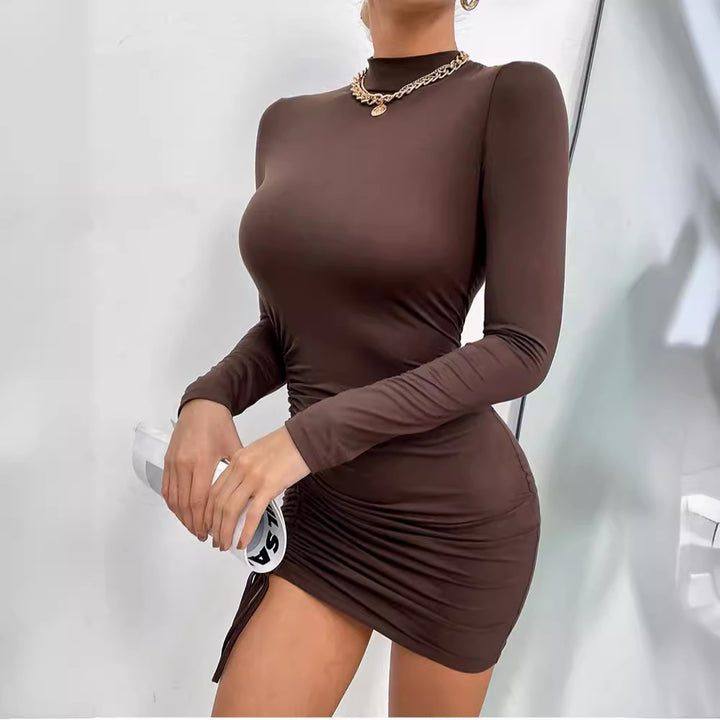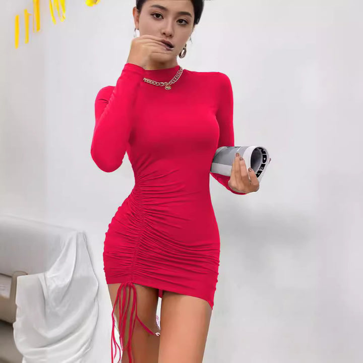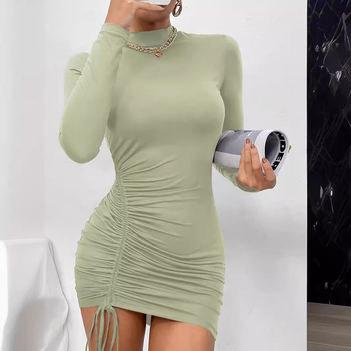 Sexy Slim Skinny Half Turtleneck Dress Simple Long Sleeve Crew Neck Drawstring Slim Dress