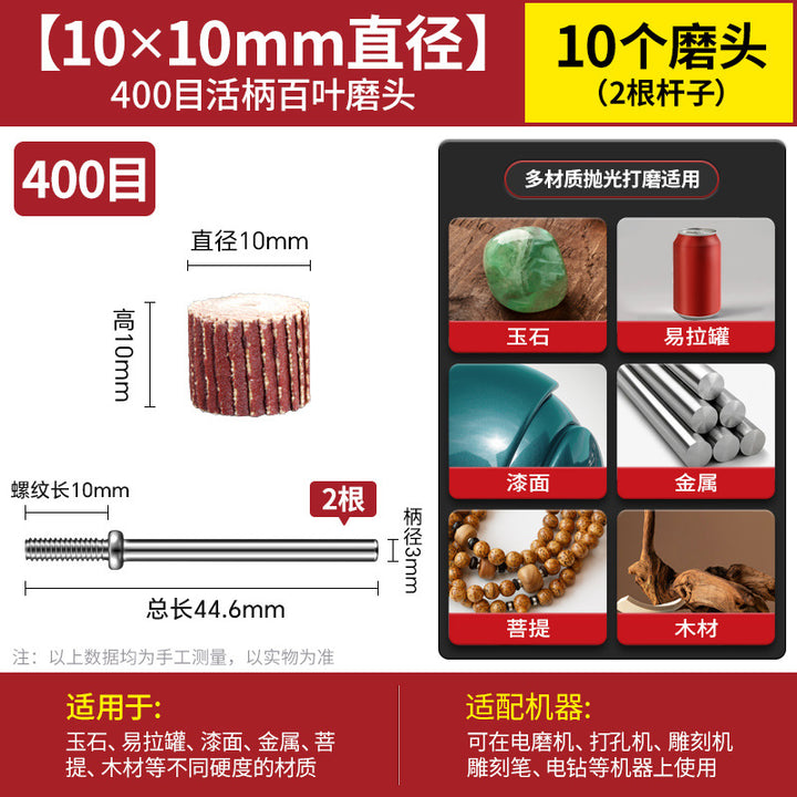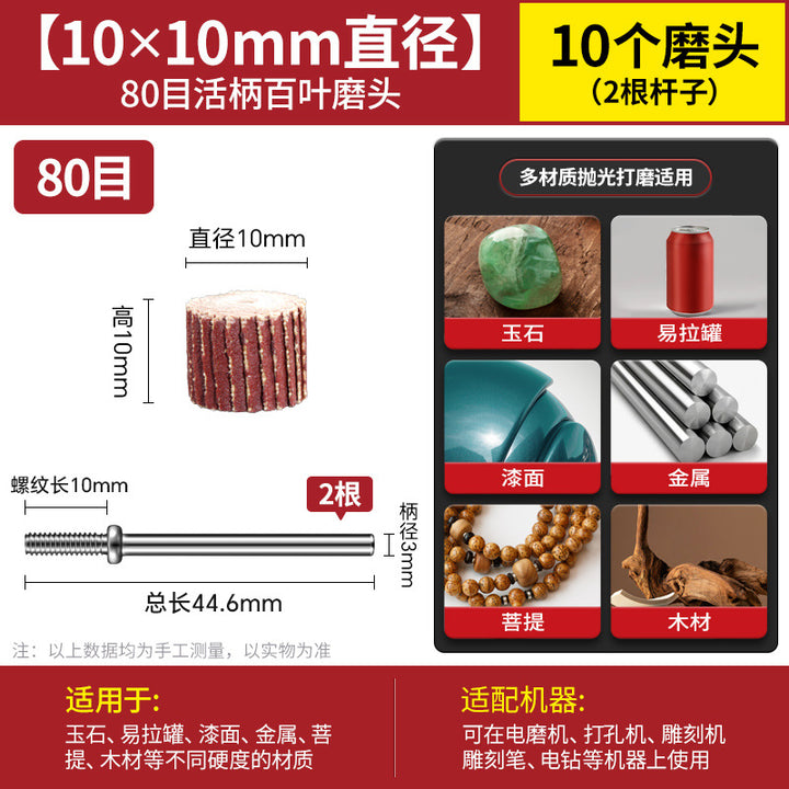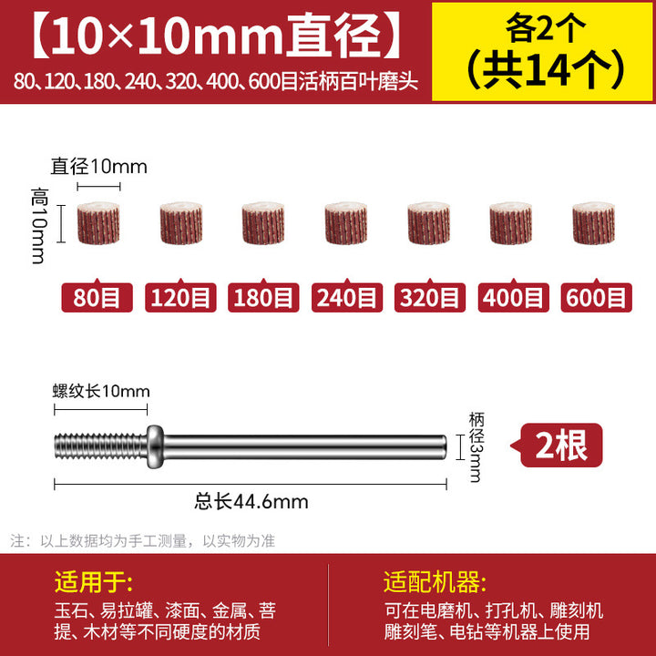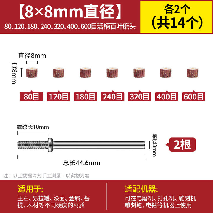 [80 mesh 8 * 8mm] 10 pcs + 3.0 handle 2 pcs, [120 mesh 8 * 8mm] 10 pcs + 3.0 handle 2 pcs, [180 mesh 8 * 8mm] 10 pcs + 3.0 handle 2 pcs, [240 mesh 8 * 8mm] 10 pcs + 3.0 handle 2 pcs, [320 mesh 8 * 8mm] 10 pcs + 3.0 handle 2 pcs, [400 mesh 8 * 8mm] 10 pcs + 3.0 handle 2 pcs, 【600目8*8mm】10个+3.0柄2支, 【7个目数8*8各2个】共14个+3.0柄2支, ——以下为百叶轮10*10mm——, 【80目10*10mm】10个+3.0柄2支, 【120目10*10mm】10个+3.0柄2支, 【180目10*10mm】10个+3.0柄2支, [240 mesh 10 * 10mm] 10 pcs + 3.0 handle 2 pcs, [320 mesh 10 * 10mm] 10 pcs + 3.0 handle 2 pcs, [400 mesh 10 * 10mm] 10 pcs + 3.0 handle 2 pcs, [600 mesh 10 * 10mm] 10 pcs + 3.0 handle 2 pcs, [7 mesh numbers 10 * 10 2 each] A total of 14 + 3.0 handle 2 pcs, - - Below is the louver 13 * 12mm -, [80 mesh 13 * 12mm] 10 pcs + 3.0 handle 2 pcs, [120 mesh 13 * 12mm] 10 pcs + 3.0 handle 2 pcs, [180 mesh 13 * 12mm] 10 pcs + 3.0 handle 2 pcs, 【240目13*12mm】10个+3.0柄2支, 【320目13*12mm】10个+3.0柄2支, 【400目13*12mm】10个+3.0柄2支, 【600目13*12mm】10个+3.0柄2支, 【7个目数13*12各2个】共14个+3.0柄2支, ——以下为百叶轮15*14mm——, 【80目15*14mm】10个+3.0柄2支, [120 mesh 15 * 14mm] 10 pcs + 3.0 handle 2 pcs, [180 mesh 15 * 14mm] 10 pcs + 3.0 handle 2 pcs, [240 mesh 15 * 14mm] 10 pcs + 3.0 handle 2 pcs, [320 mesh 15 * 14mm] 10 pcs + 3.0 handle 2 pcs, [400 mesh 15 * 14mm] 10 pcs + 3.0 handle 2 pcs, [600 mesh 15 * 14mm] 10 pcs + 3.0 handle 2 pcs, [7 mesh numbers 15 * 14 2 each] A total of 14 + 3.0 handle 2 pcs, - - Below is the louver 20 * 16mm -, [80 mesh 20 * 16mm] 10 pcs + 3.0 handle 2 pcs, [120 mesh 20 * 16mm] 10 pcs + 3.0 handle 2 pcs, [180 mesh 20 * 16mm] 10 pcs + 3.0 handle 2 pcs, 【240目20*16mm】10个+3.0柄2支, 【320目20*16mm】10个+3.0柄2支, 【400目20*16mm】10个+3.0柄2支, 【600目20*16mm】10个+3.0柄2支, 【7个目数20*16各2个】共14个+3.0柄2支 |