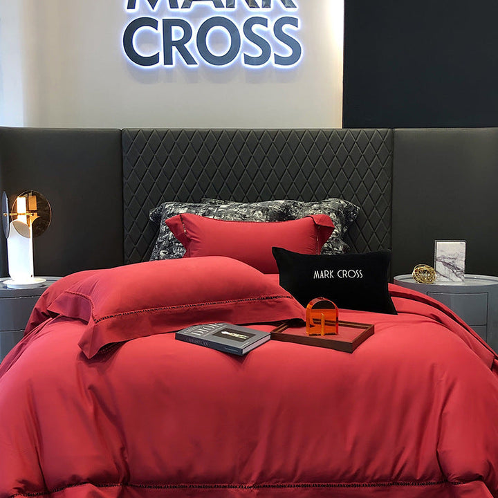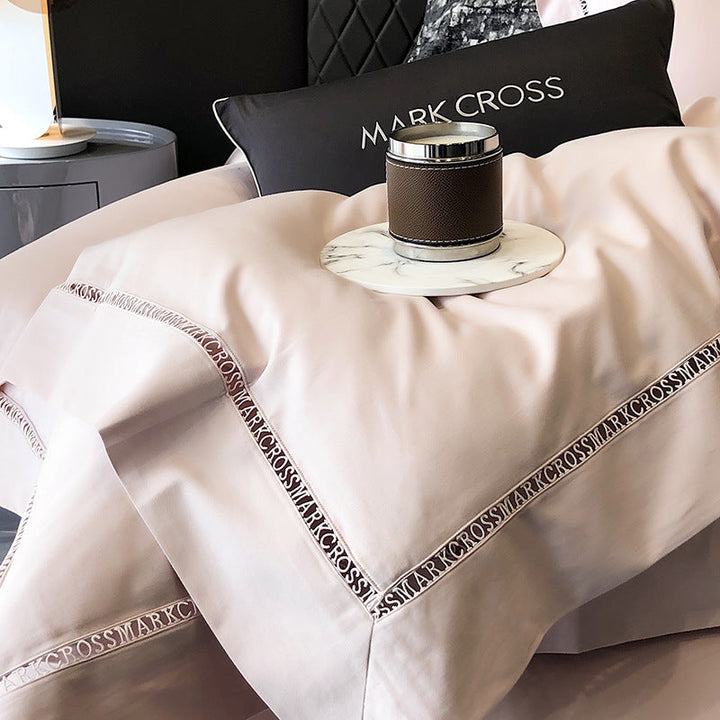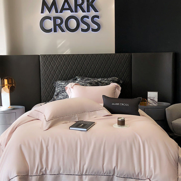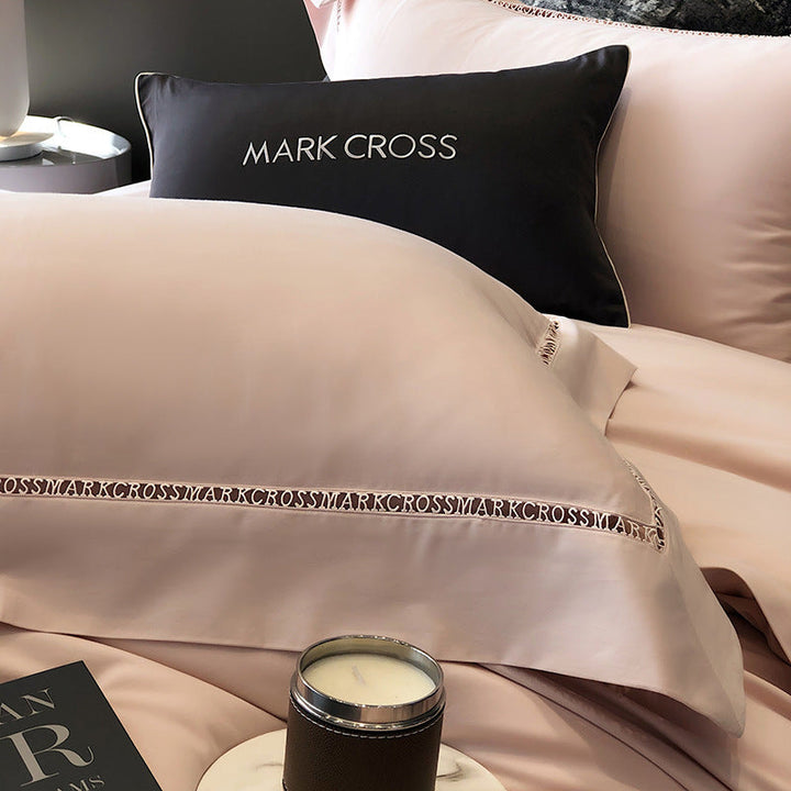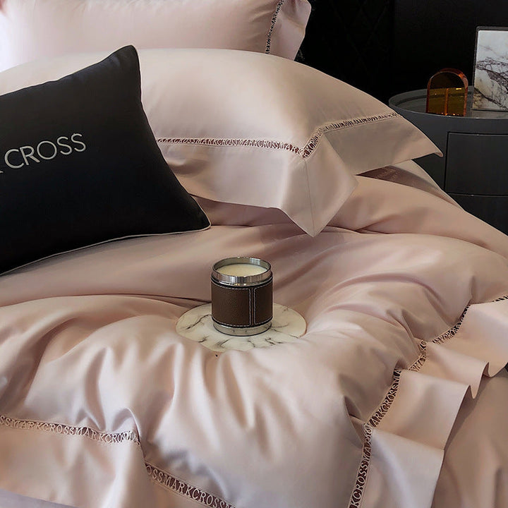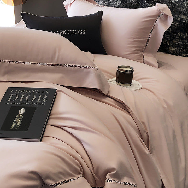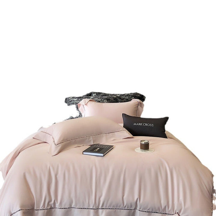 Simple solid color 100 cotton abraded four-piece set hollow edge quilt cover autumn and winter naked sleeping double skin-friendly light luxury style