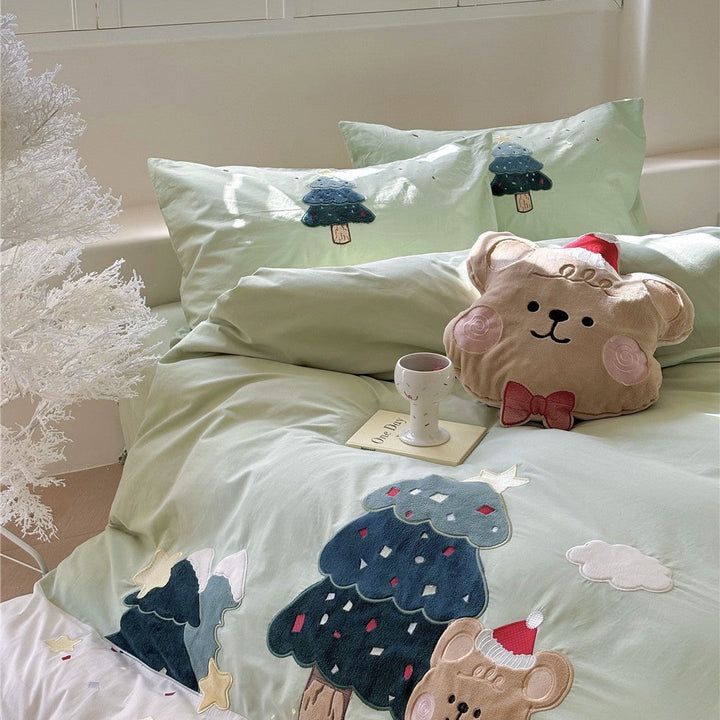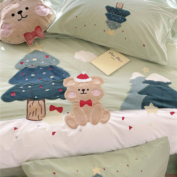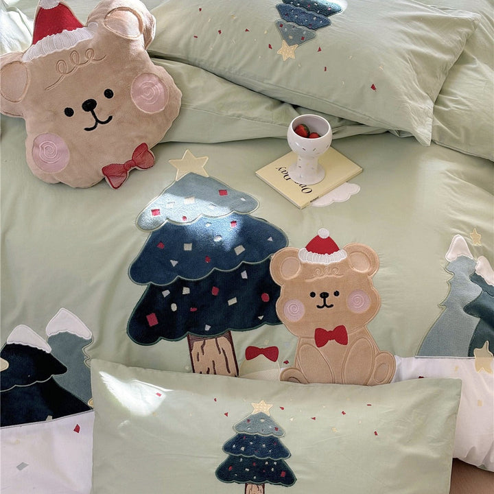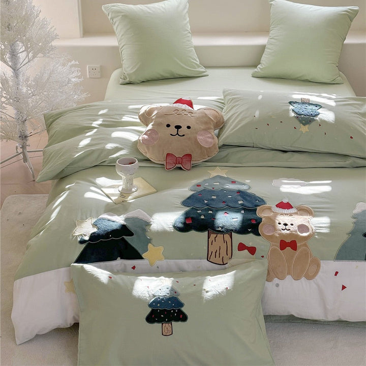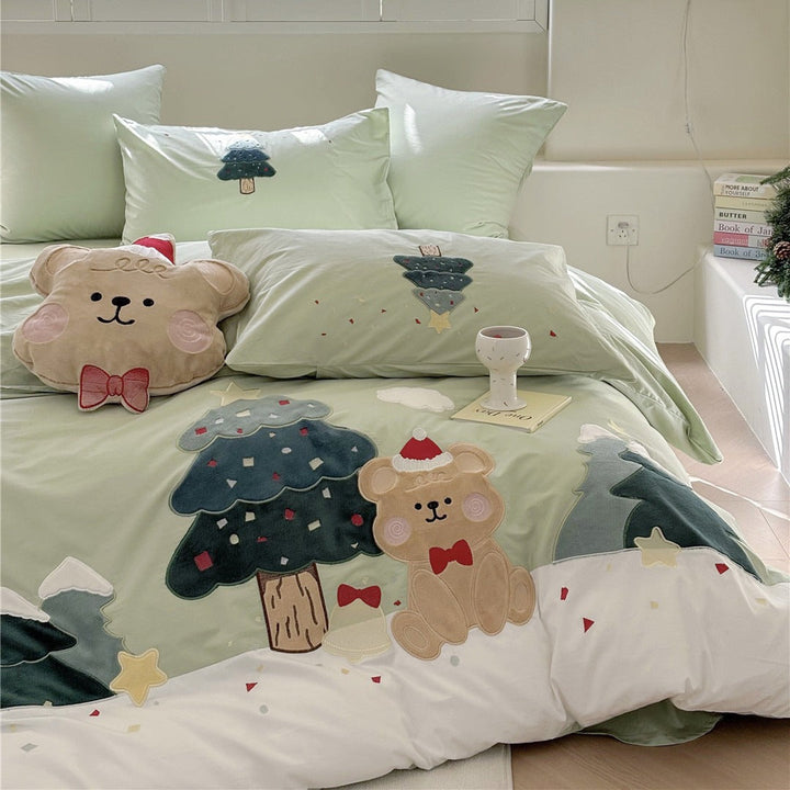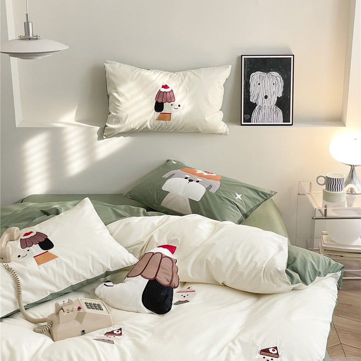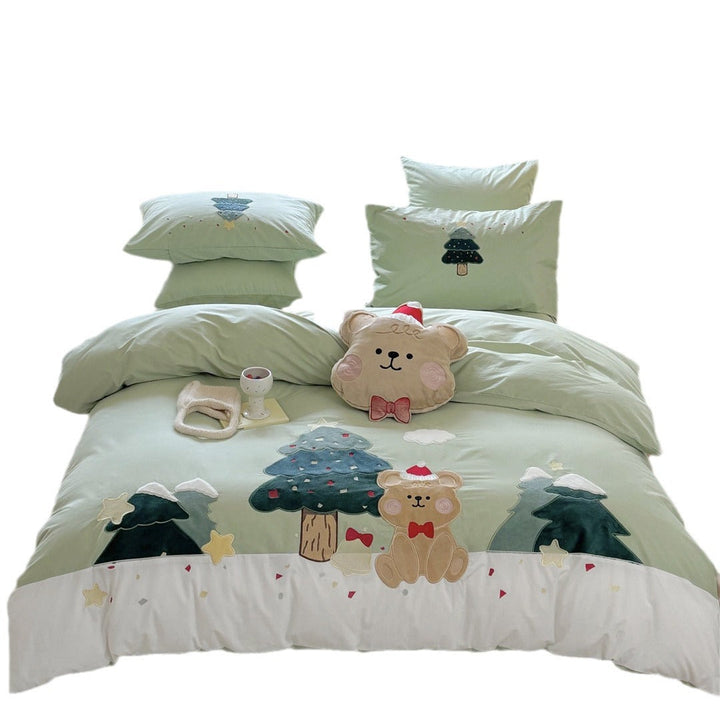 Small fresh cartoon style embroidered bedding single double bedding high-grade pure cotton washed cotton three or four piece set home textile