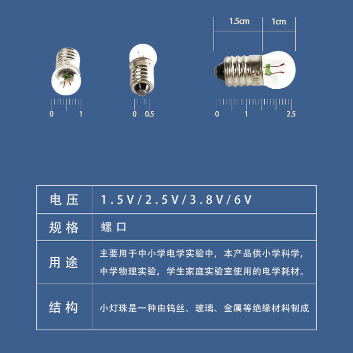 1.5V small light bulb, 2.5V bulb, 3.8V light bulb, 6V bulb, 12V bulb |