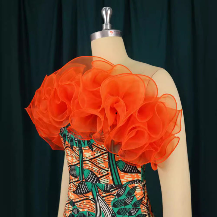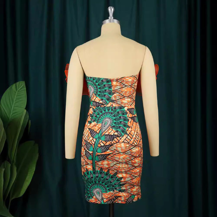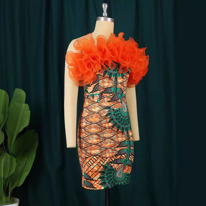 Small sexy print shoulder mesh stitching dress, banquet party dress slip dress