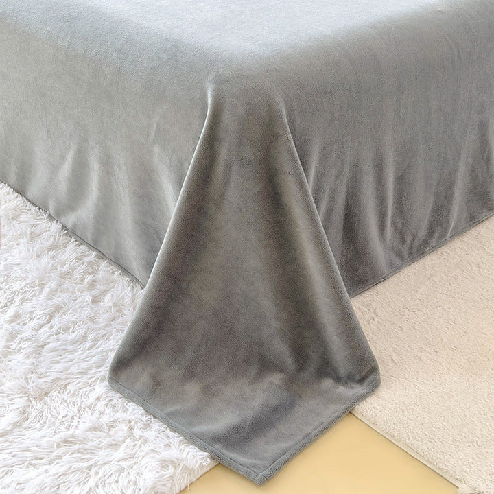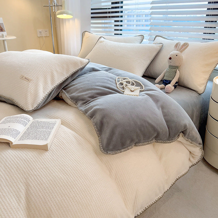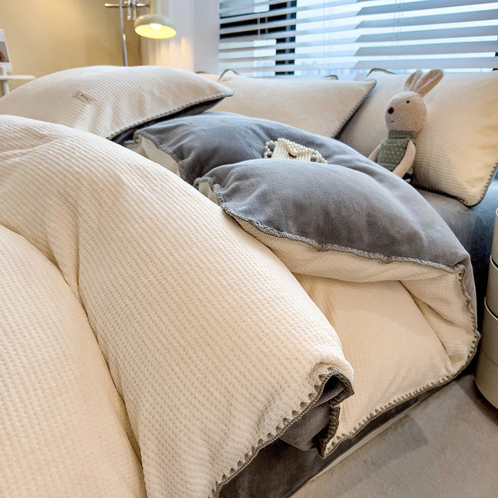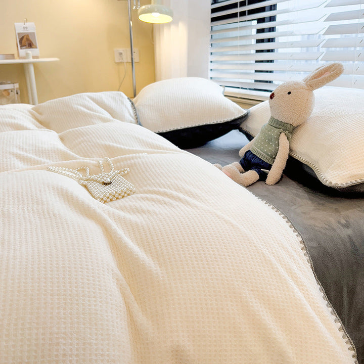 Solid color milk fleece four-piece set, shell edge waffle quilt cover, winter coral fleece sheet quilt cover, bed three-piece set