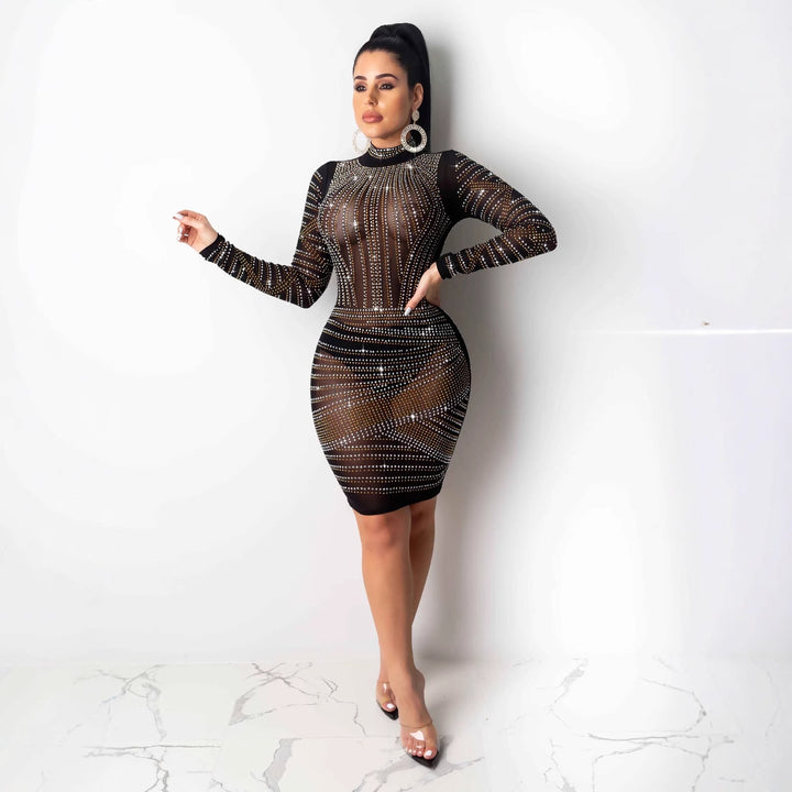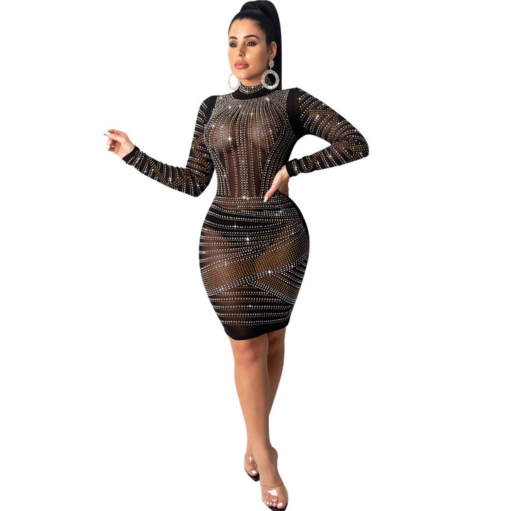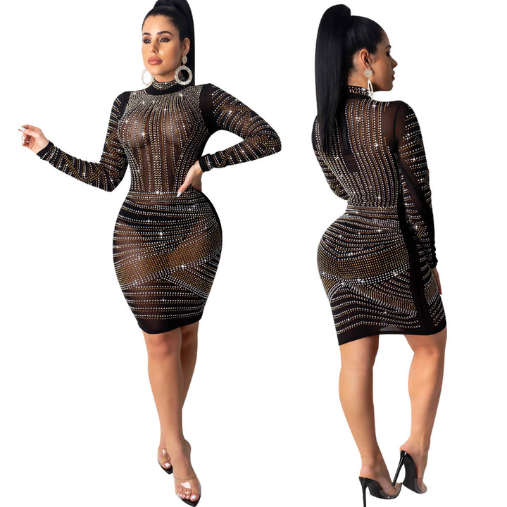 Spot! K8865 European and American sexy, perspective, hot diamond long-sleeved dress nightclub
