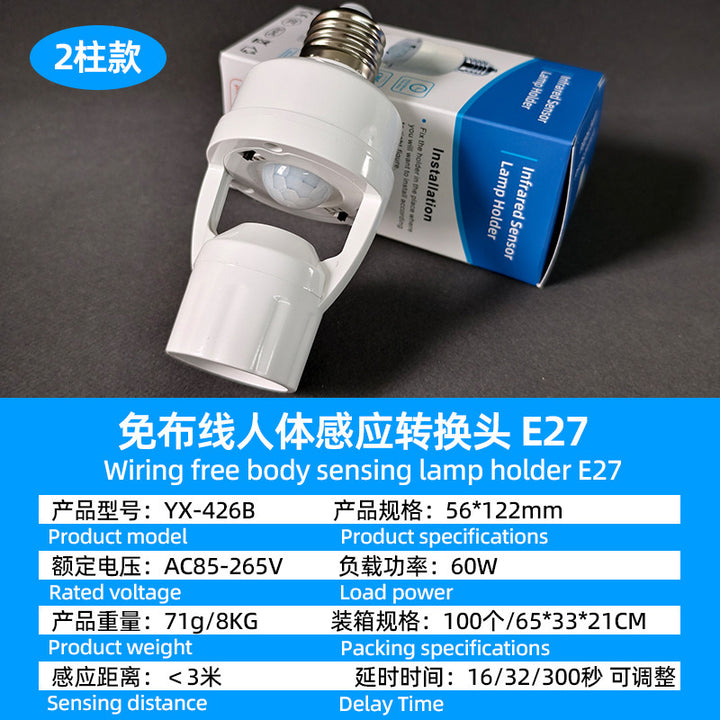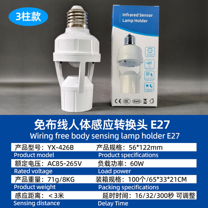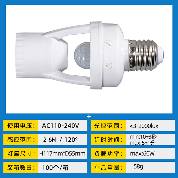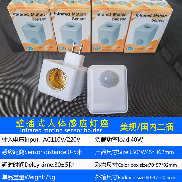 Square human body sensor lamp holder E27, Human body induction lamp head E27 [toggle switch] two pillars, Human body infrared sensor lamp holder E27 [knob switch] two pillars, Human body induction lamp head E27 [toggle switch] three pillars, Human body induction lamp head E27 [knob switch] three pillars, Sound and light control lamp holder E27 (sound control), Radar sensor lamp head E27, Wall plug human body sensor lamp holder E27, Wireless remote control lamp holder E27 (with remote control), Offline voice lamp holder E27 |