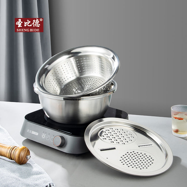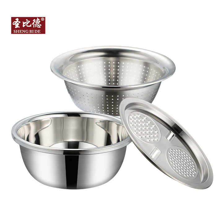 Stainless steel basin, vegetable washing basin, drain basket with planed wire cover, soup basin and noodles, egg washing, rice sieve set, kitchen h...