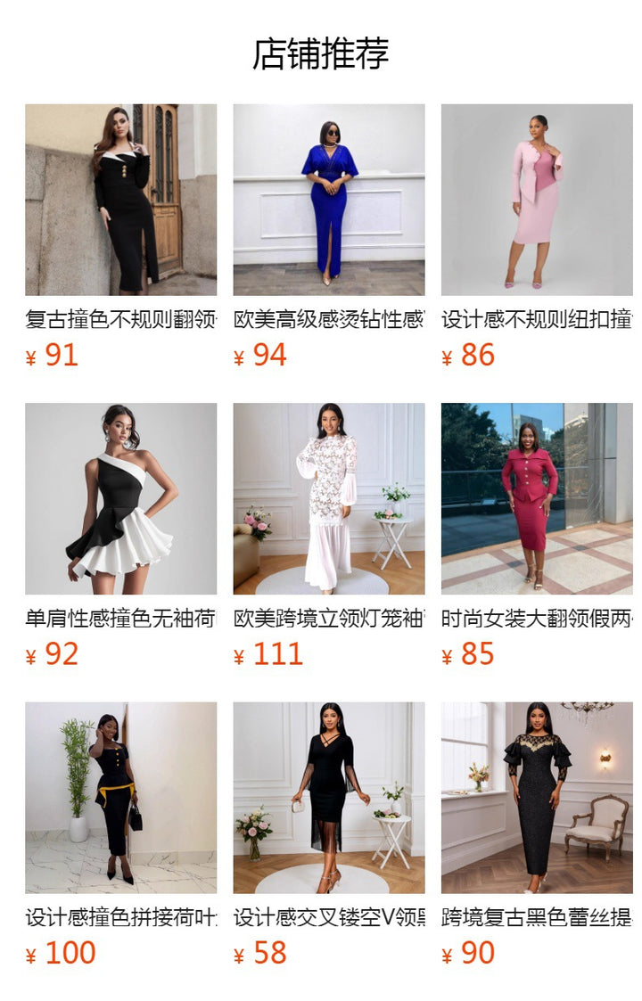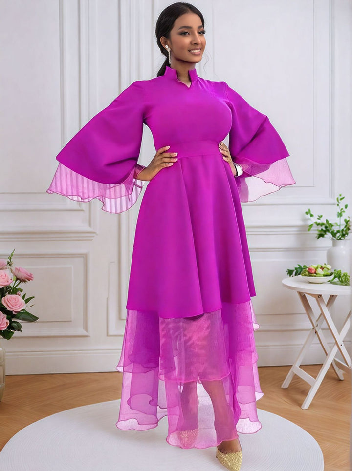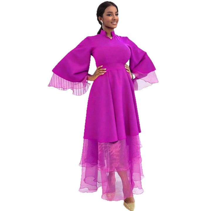 Stand-up collar, horn sleeves, stitching mesh long-sleeved dresses, high-waisted elegant part...