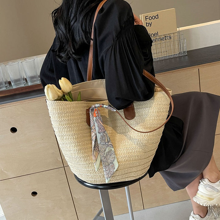 Straw bag women's large capacity 2025 new vacation beach straw bag woven commuter bucket bag vegetable basket tote bag