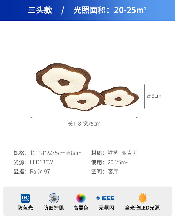 White + walnut three-headed living room light 118 * 75cm, White + walnut single head bedroom light 50cm |