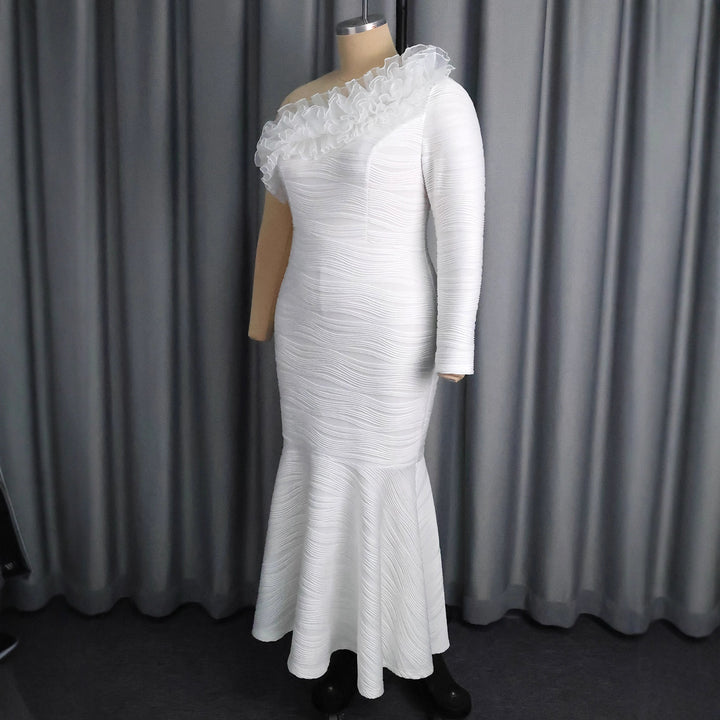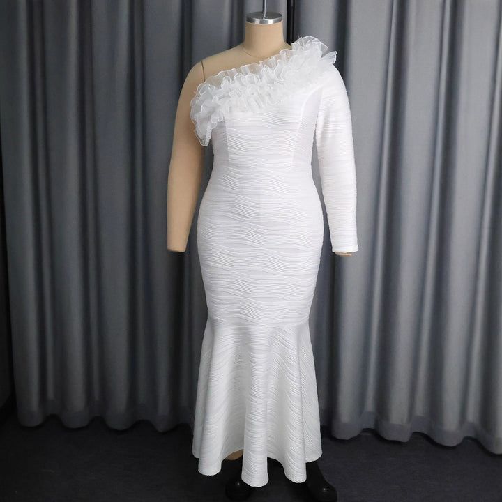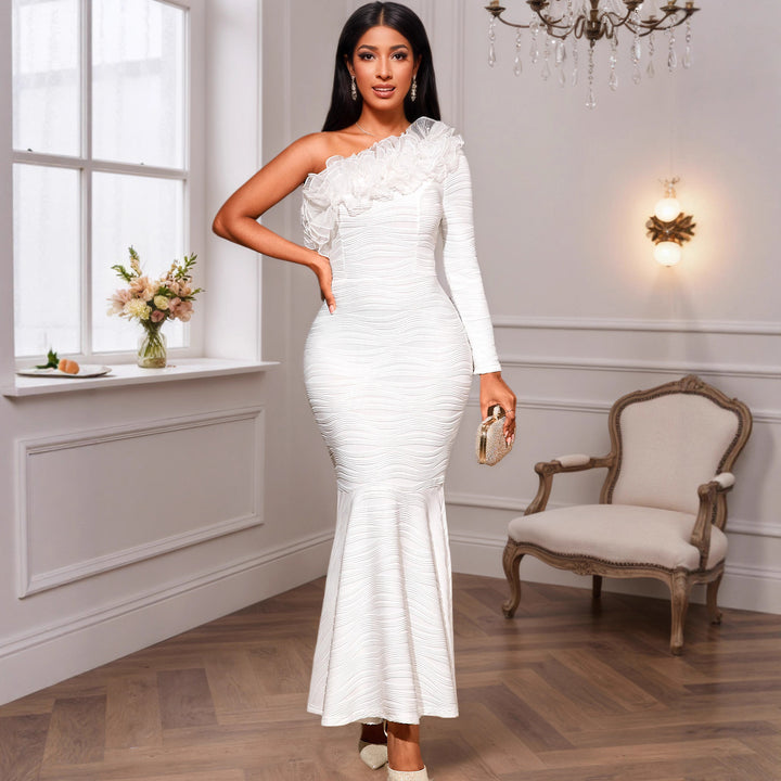 Stylish and elegant water ripple one-shoulder long-sleeved dress, ruffle edge slim-fitting hip-wrapped fishtail dress evening dress
