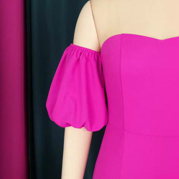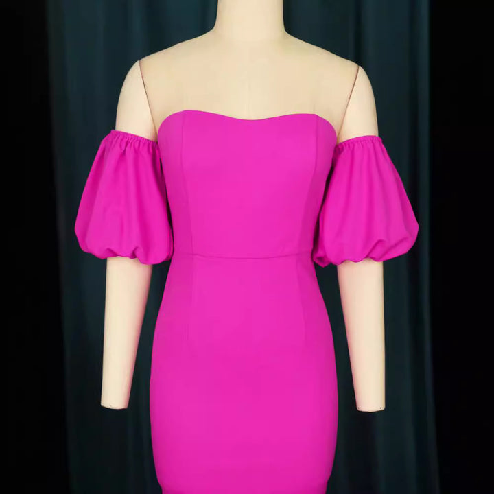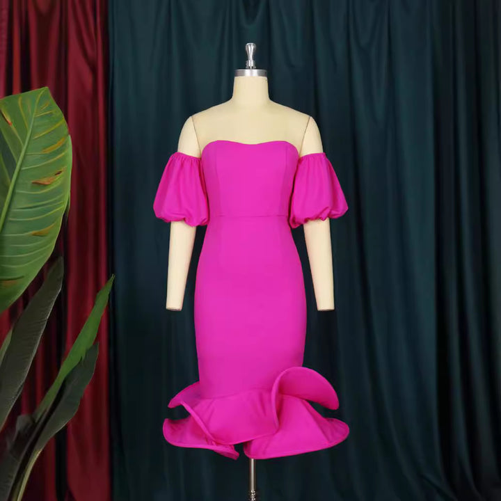 Summer new bubble sleeve tube top one-word shoulder high waist ruffle edge medium and long dr...