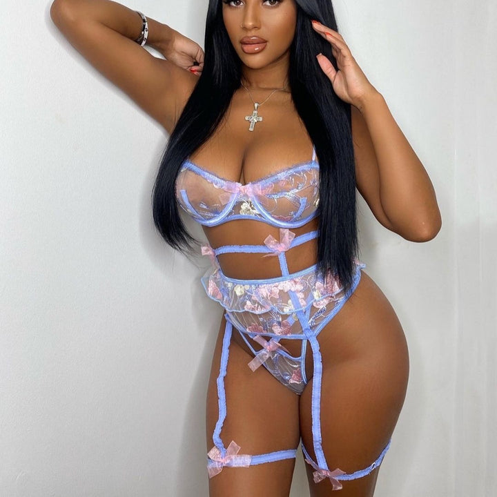 summer new embroidered lingerie three-piece set flower fascination waist seal garter belt sexy woman 3030