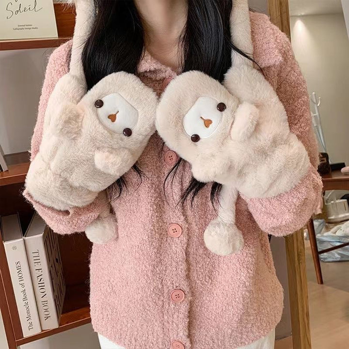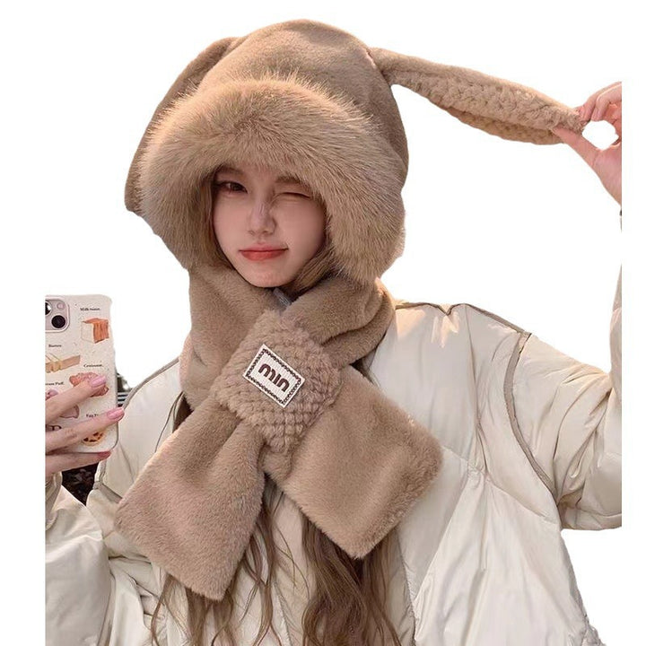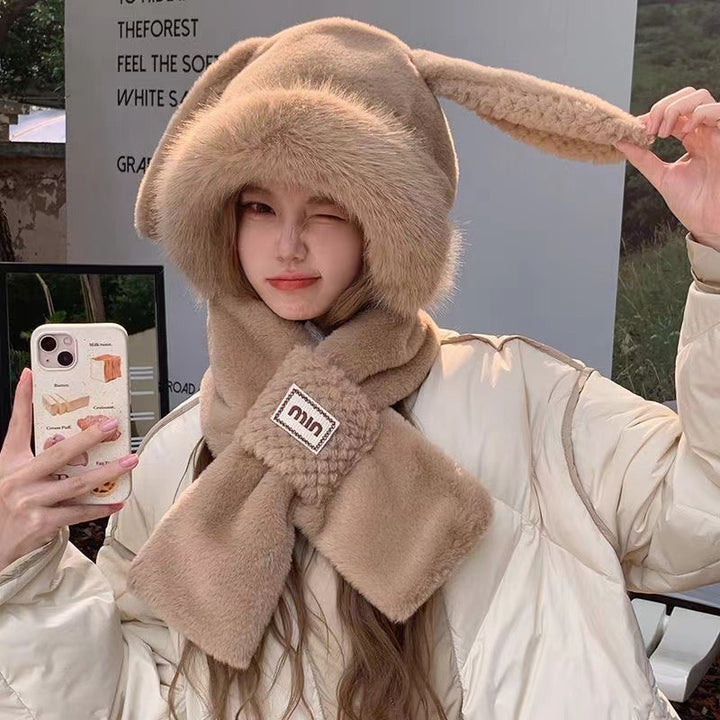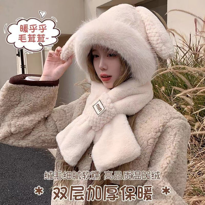 Super cute long-eared rabbit hat integrated plush hat women's winter thickened warm hat scarf one-piece two-piece set