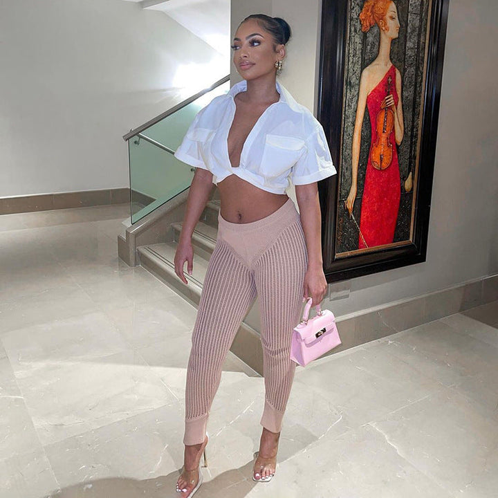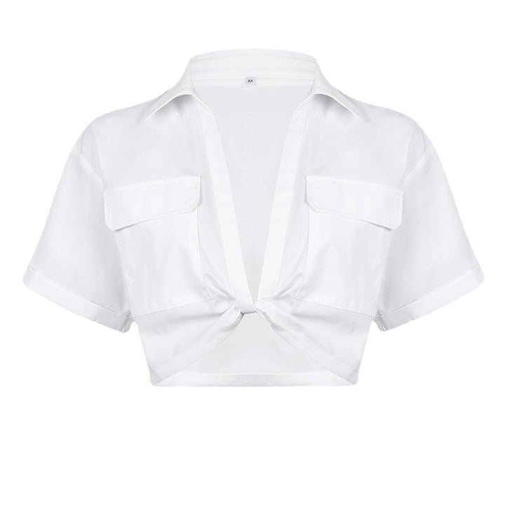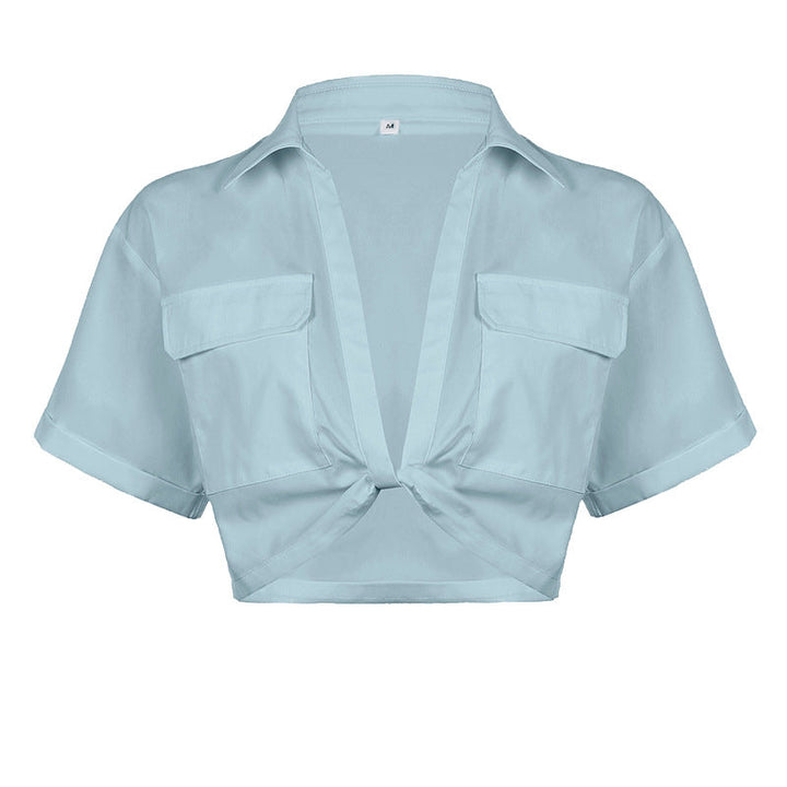 T24450 European and American style women's clothing sexy short navel kink solid color Polo collar shirt T-shirt top