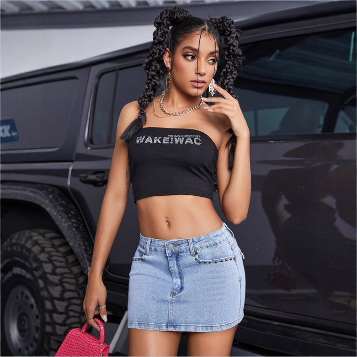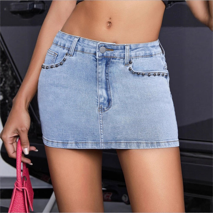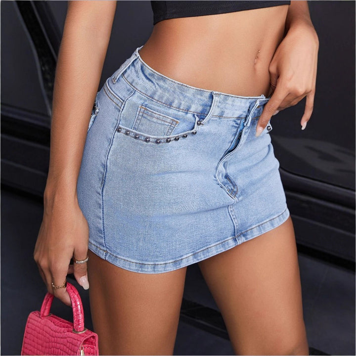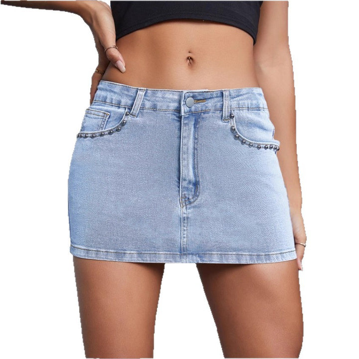 TC70074 #New Cross-border European and American Personalized Retro Spice Girl Nailed Diamond Denim Women's Denim Short Skirt Slim Skirt